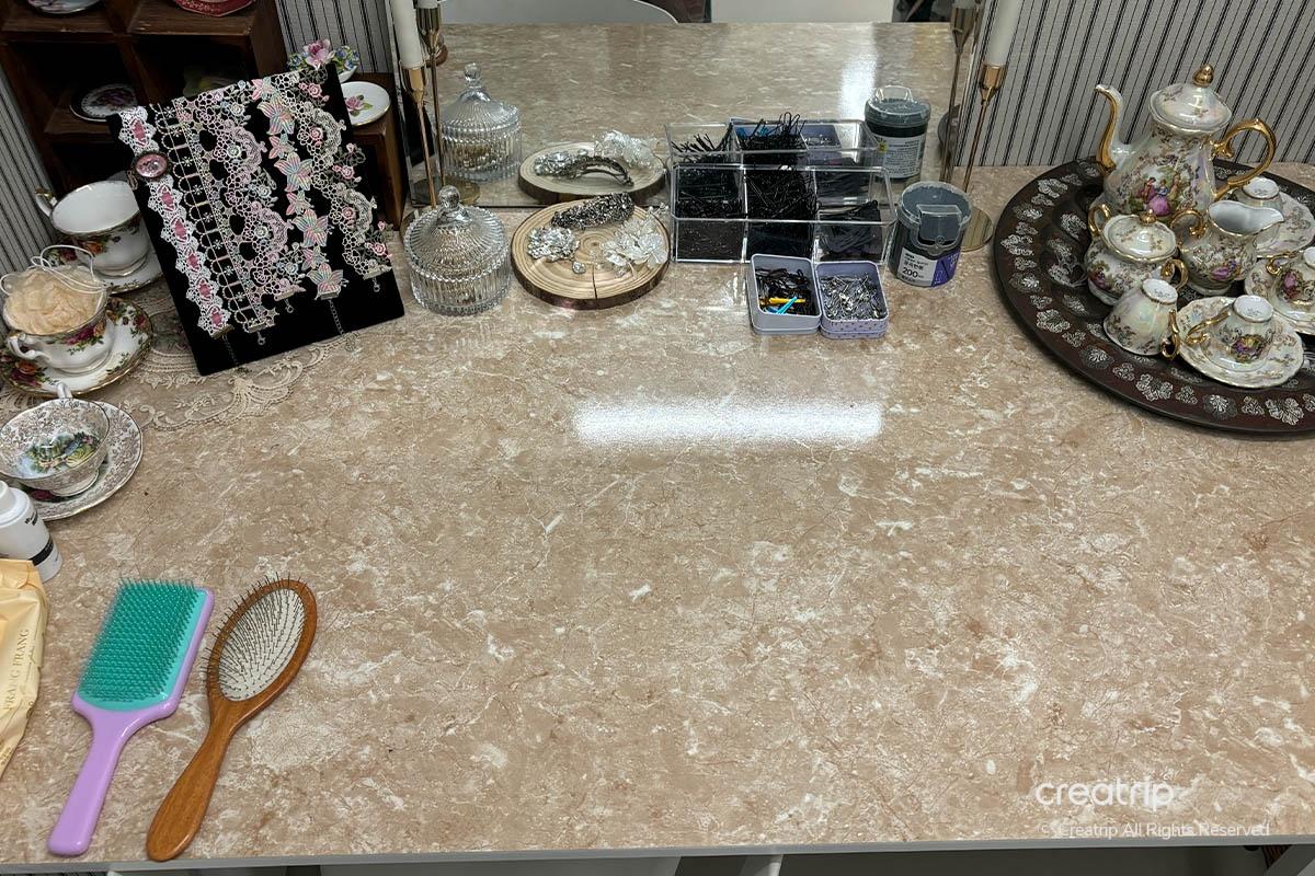 Có một bàn trang điểm gọn gàng với nhiều phụ kiện và đồ dùng làm tóc, giúp bạn dễ dàng tạo kiểu tóc.
