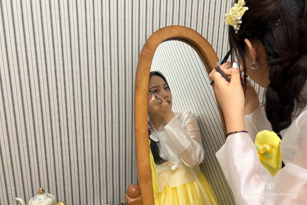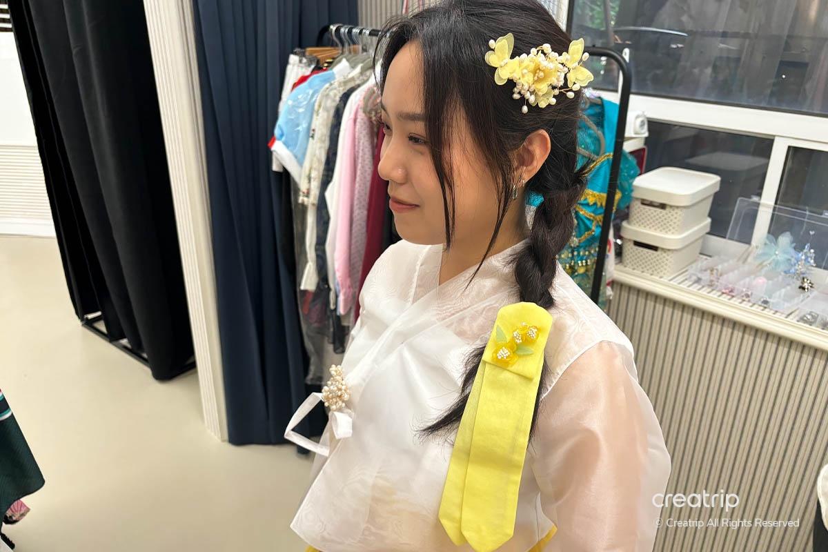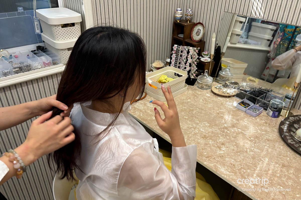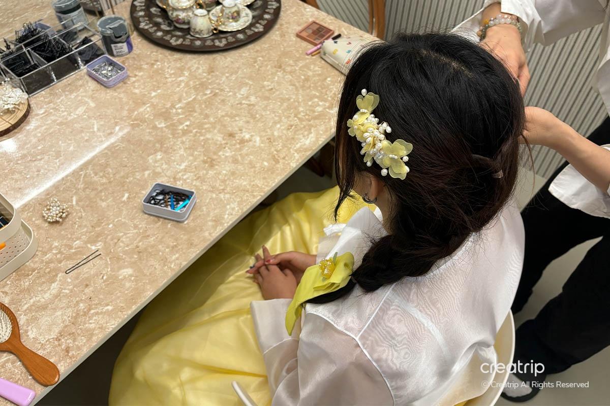 Sau khi tết tóc để phù hợp với Hanbok, tôi thêm một dải ruy băng và gắn một phụ kiện trang trí. Nhiếp ảnh gia hỏi tôi muốn làm nổi bật bên nào của khuôn mặt, sau đó đặt phụ kiện tương ứng. Tôi rất ấn tượng với mức độ chi tiết khi xem xét hướng của khuôn mặt mình!