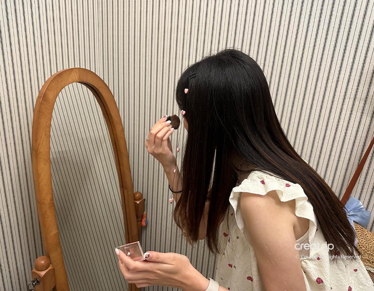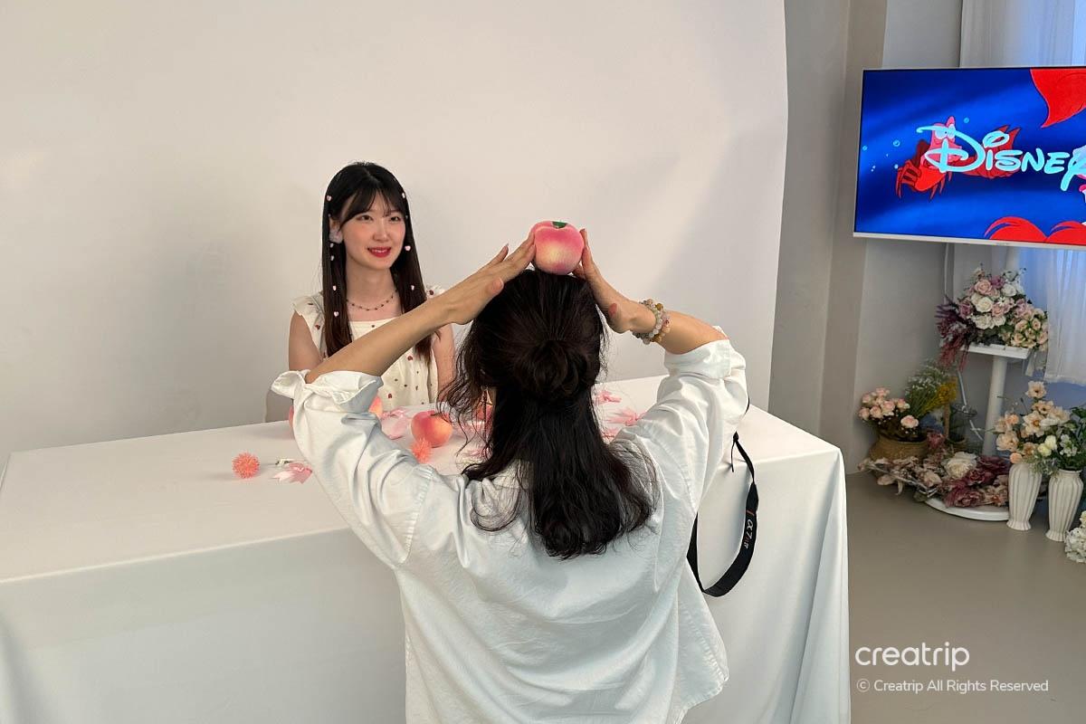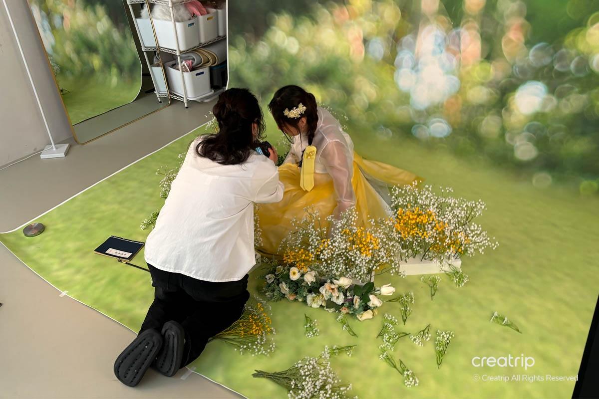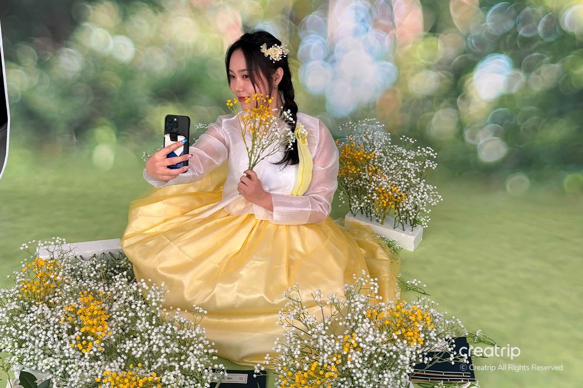 Sau khi tết tóc để phù hợp với Hanbok, tôi thêm một dải ruy băng và gắn một phụ kiện trang trí. Nhiếp ảnh gia hỏi tôi muốn làm nổi bật bên nào của khuôn mặt, sau đó đặt phụ kiện tương ứng. Tôi rất ấn tượng với mức độ chi tiết khi xem xét hướng của khuôn mặt mình!