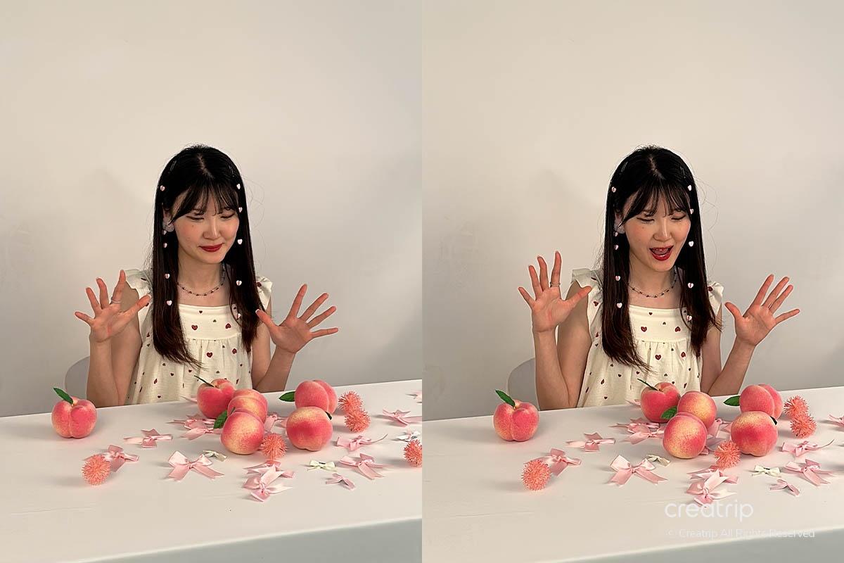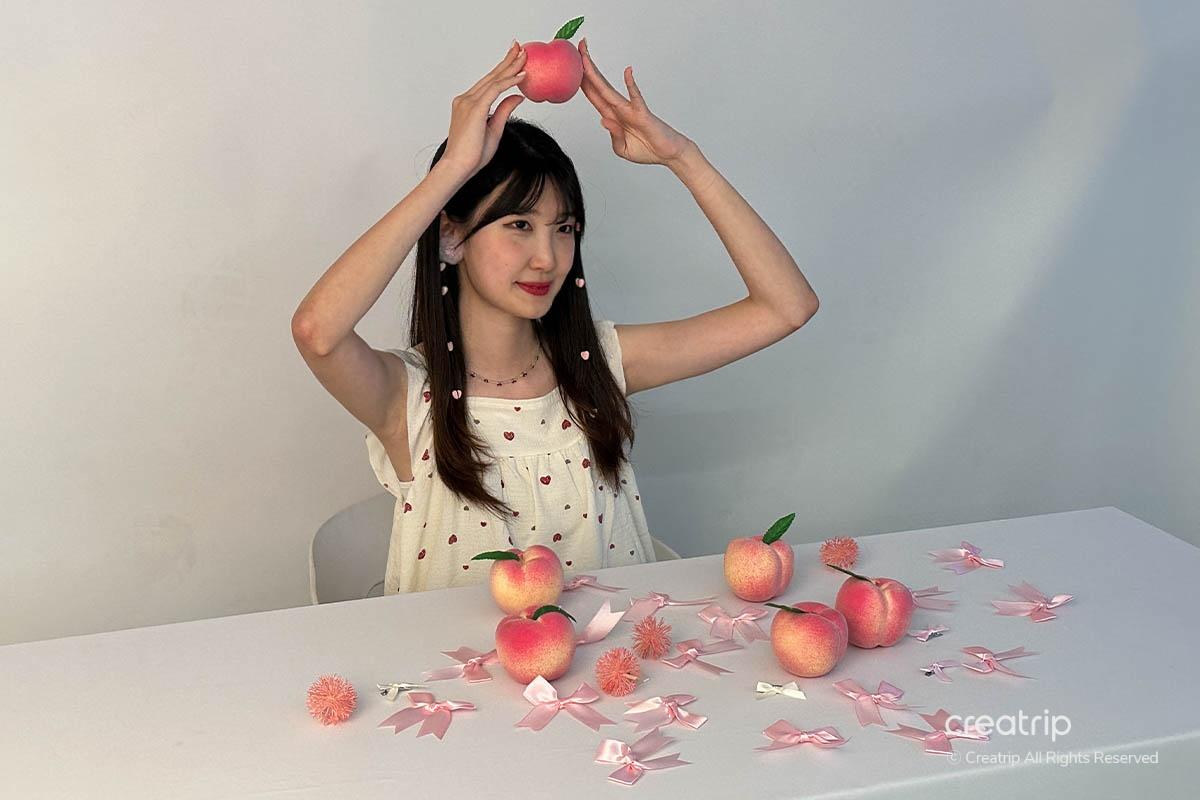 Tôi đã chụp ảnh trong nhiều tư thế khác nhau với các đạo cụ dễ thương. Ý tưởng thời thượng kết hợp phụ kiện màu hồng đào với bộ đồ ngủ đáng yêu một cách hoàn hảo.