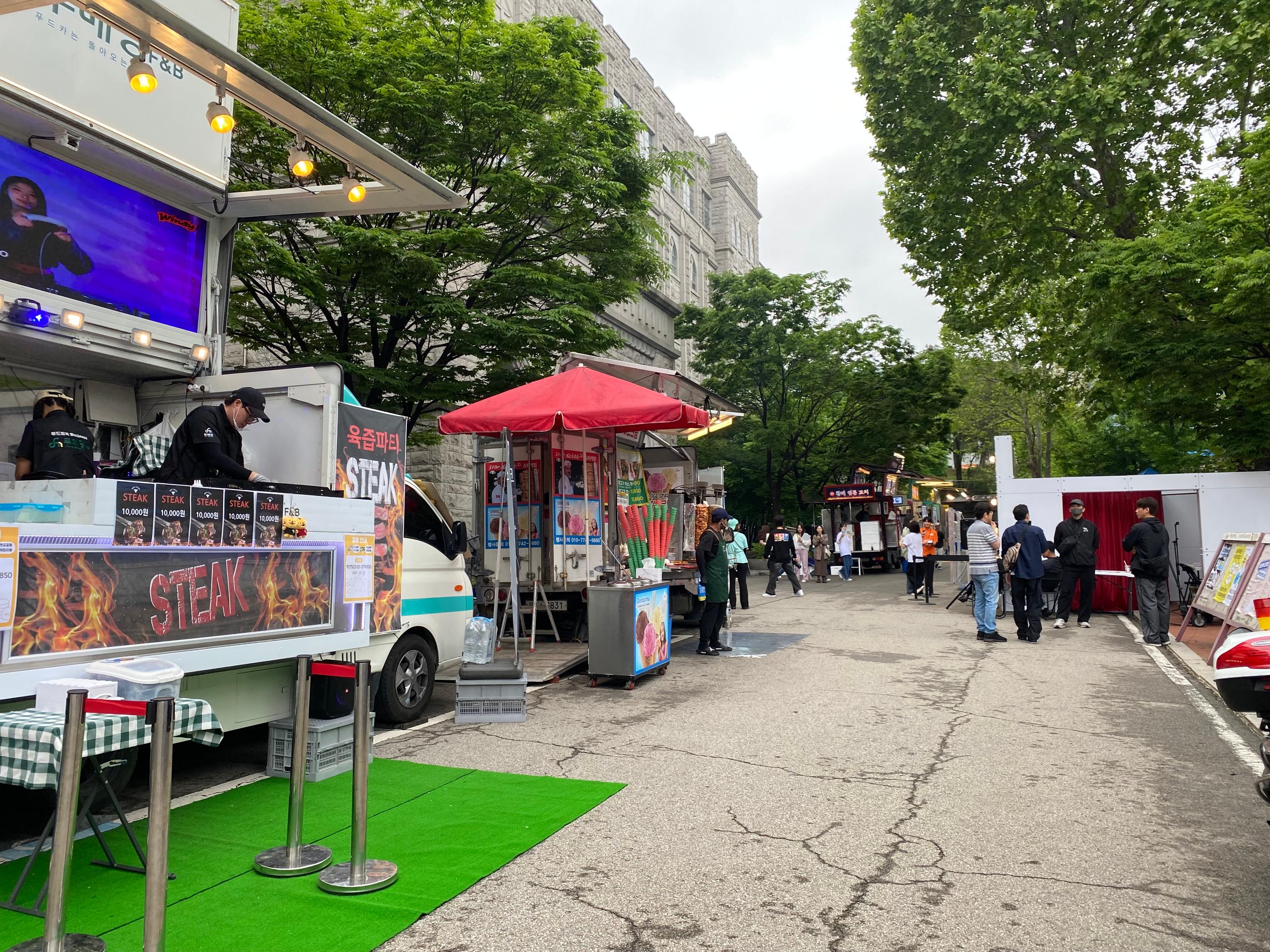 Vào ngày này, lễ hội trường đang được tổ chức, và các xe bán đồ ăn xếp hàng khắp khuôn viên trường, lan tỏa hương thơm hấp dẫn khắp không gian