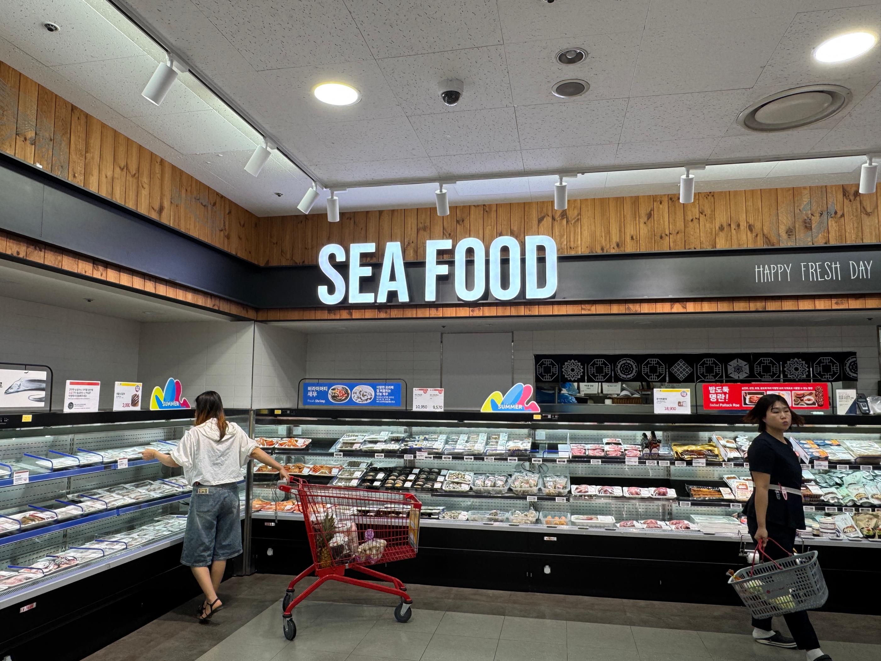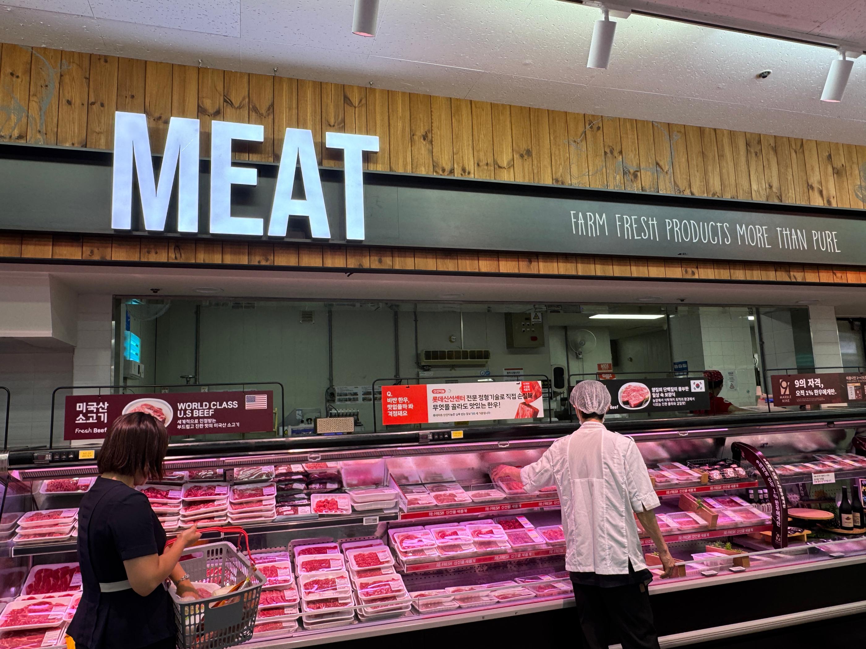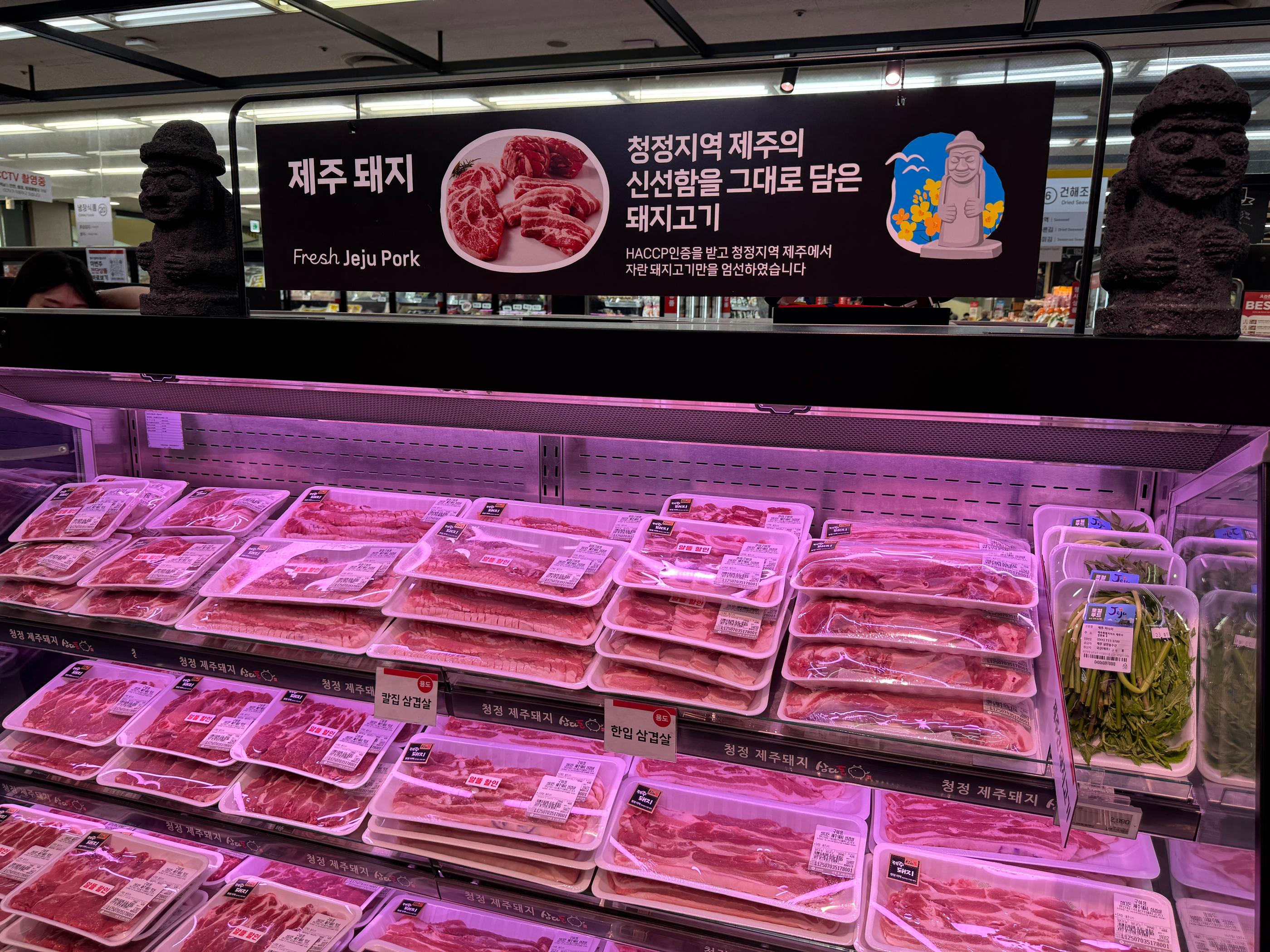 Tôi thật sự ngạc nhiên về việc khu thịt tươi lớn và đầy đủ như thế nào, có rất nhiều lựa chọn, bao gồm cả thịt heo đen nổi tiếng của Jeju.