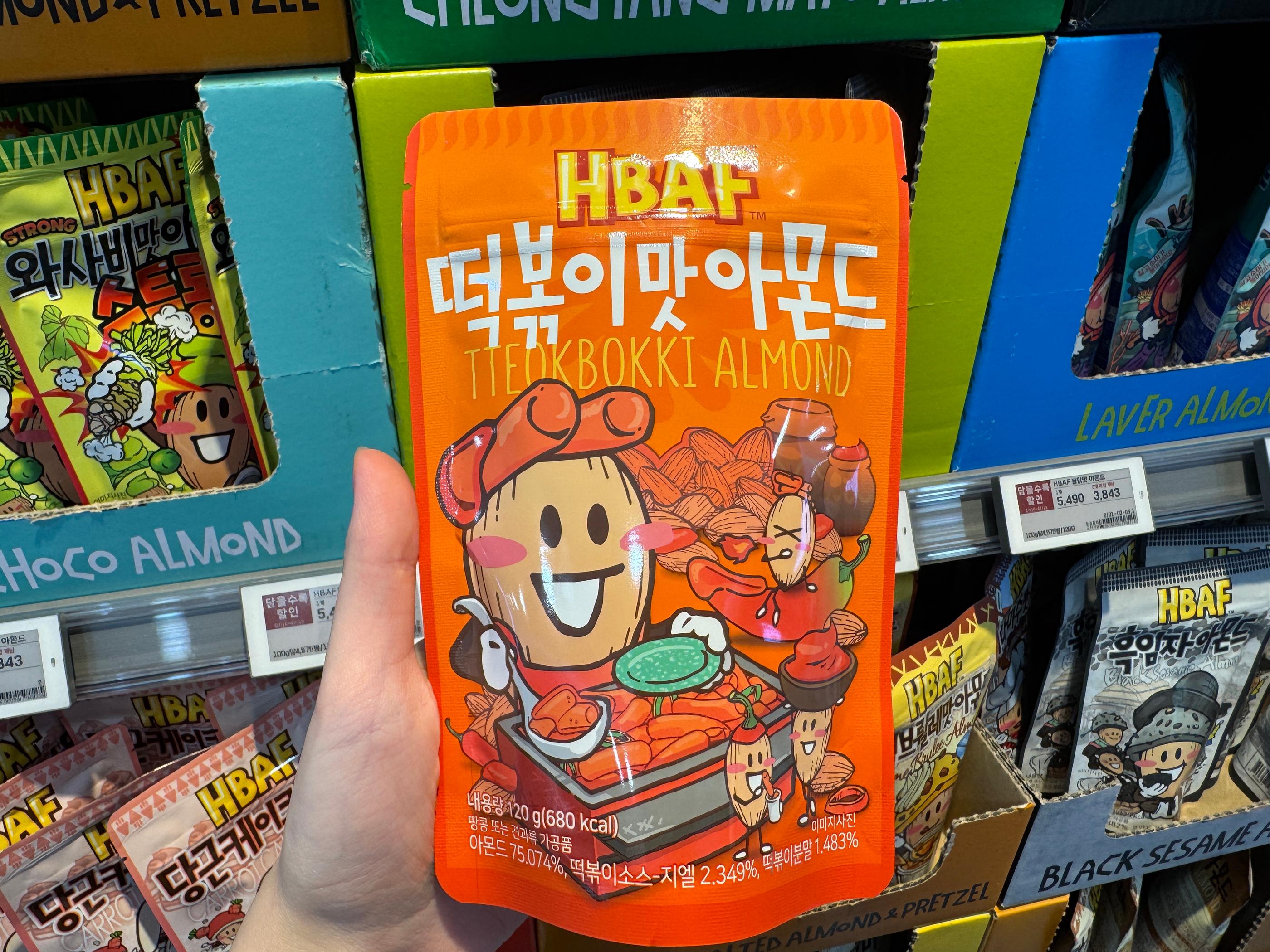 HBAF almonds cũng là món nhất định phải thử. Những món ăn vặt giòn rụm này có các hương vị vui nhộn như wasabi, rong biển và tteokbokki cay, rất thích hợp để mang về làm quà lưu niệm.