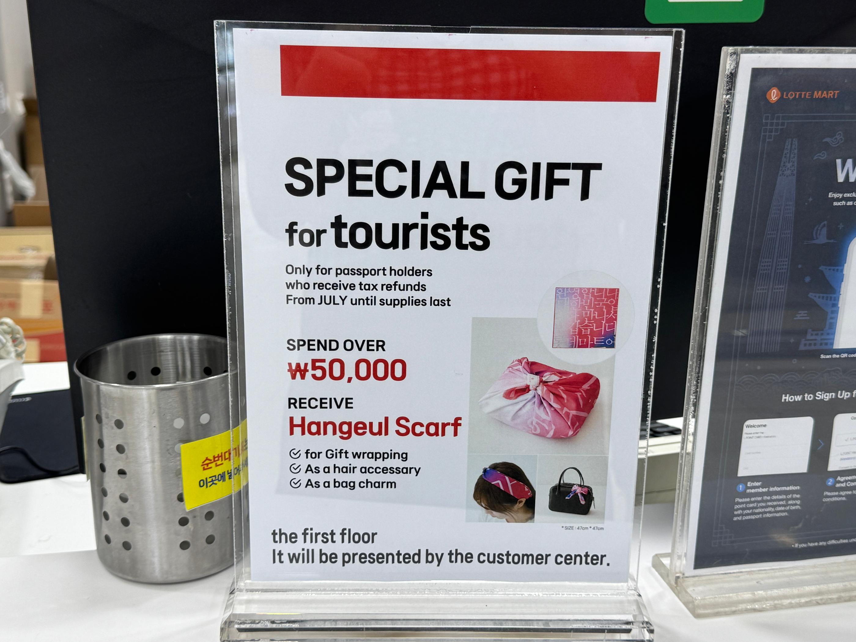 Nếu bạn chi tiêu trên 50.000 KRW, bạn có thể nhận được một Khăn quàng Hangeul miễn phí!
