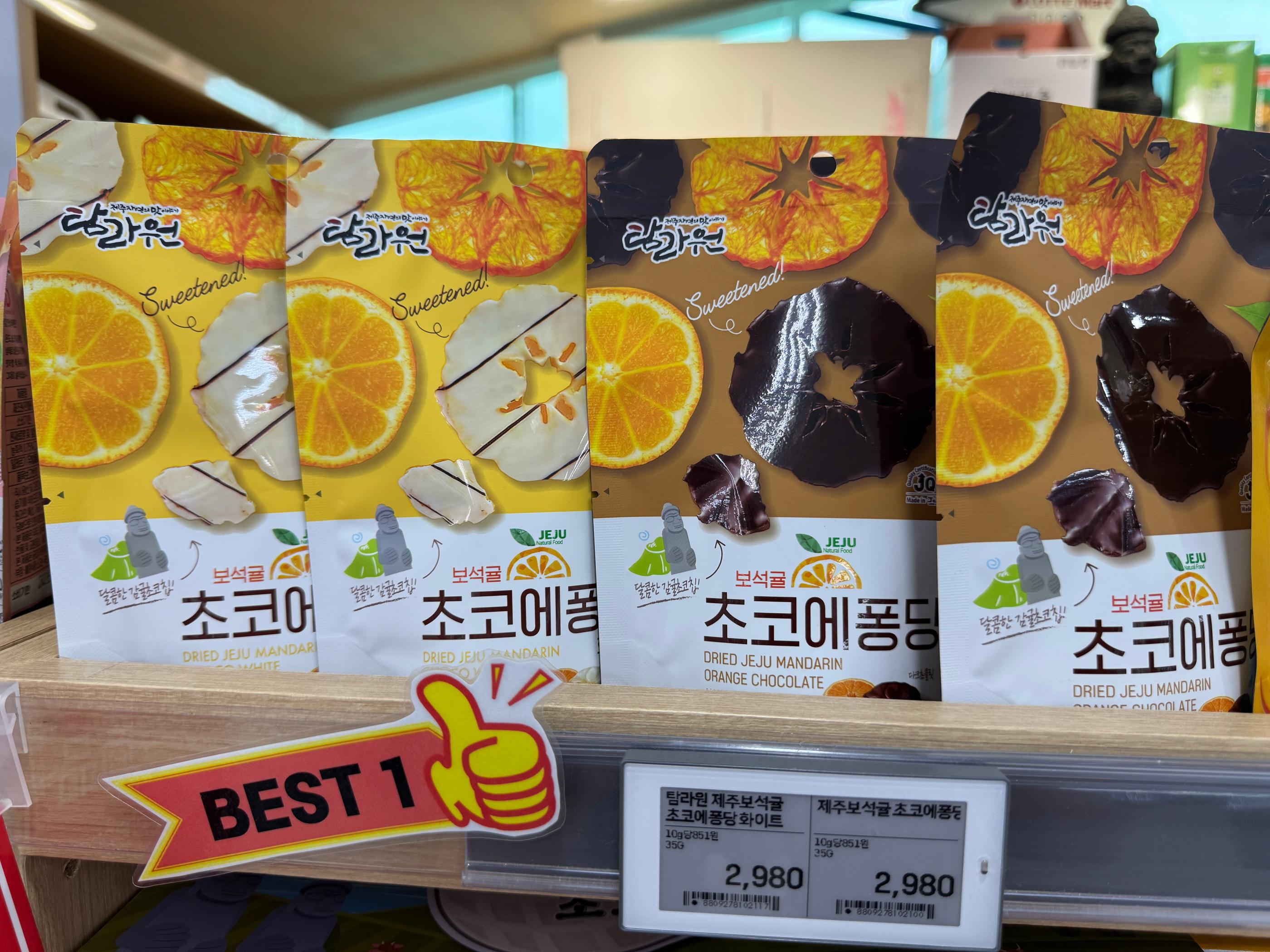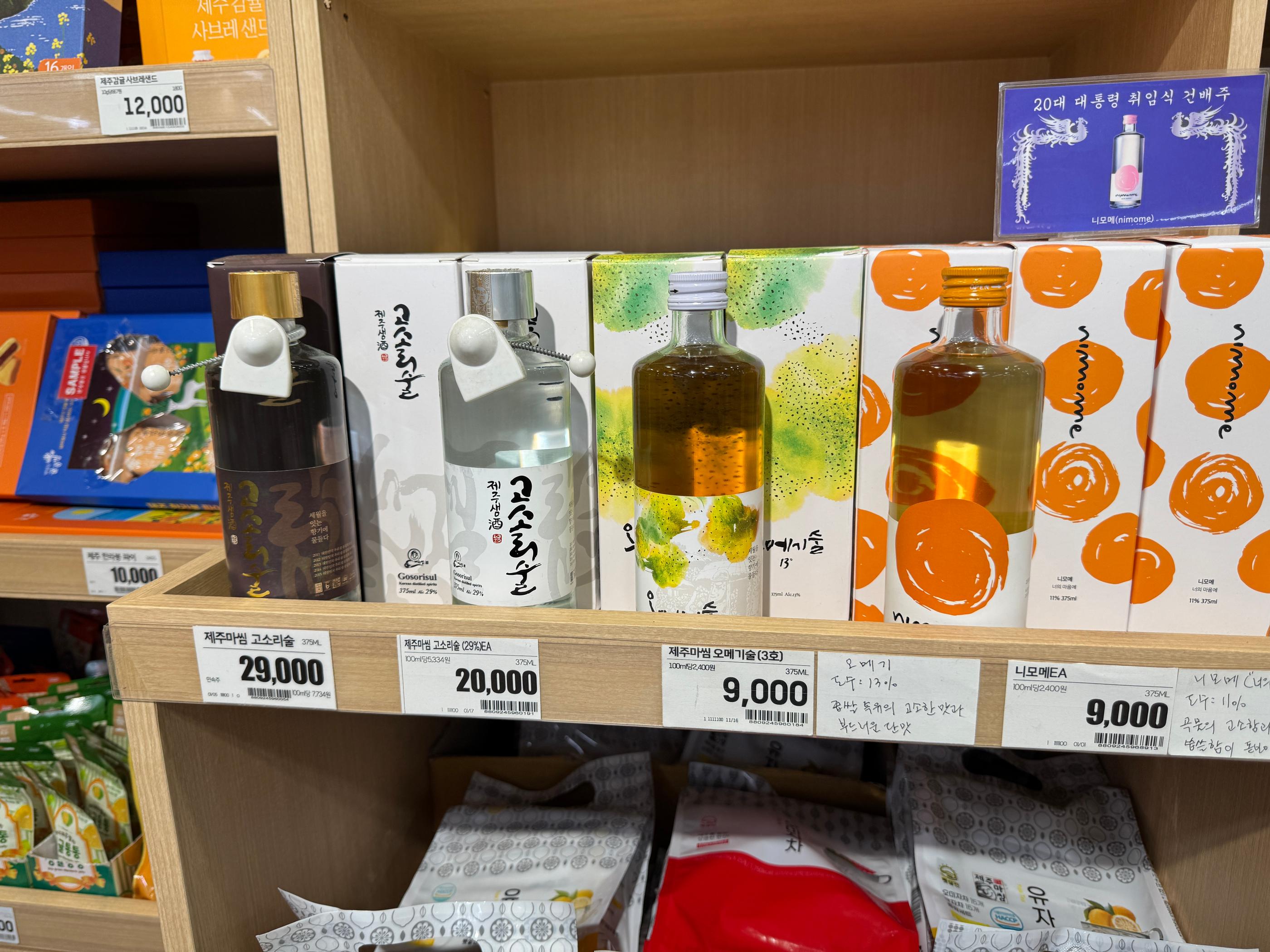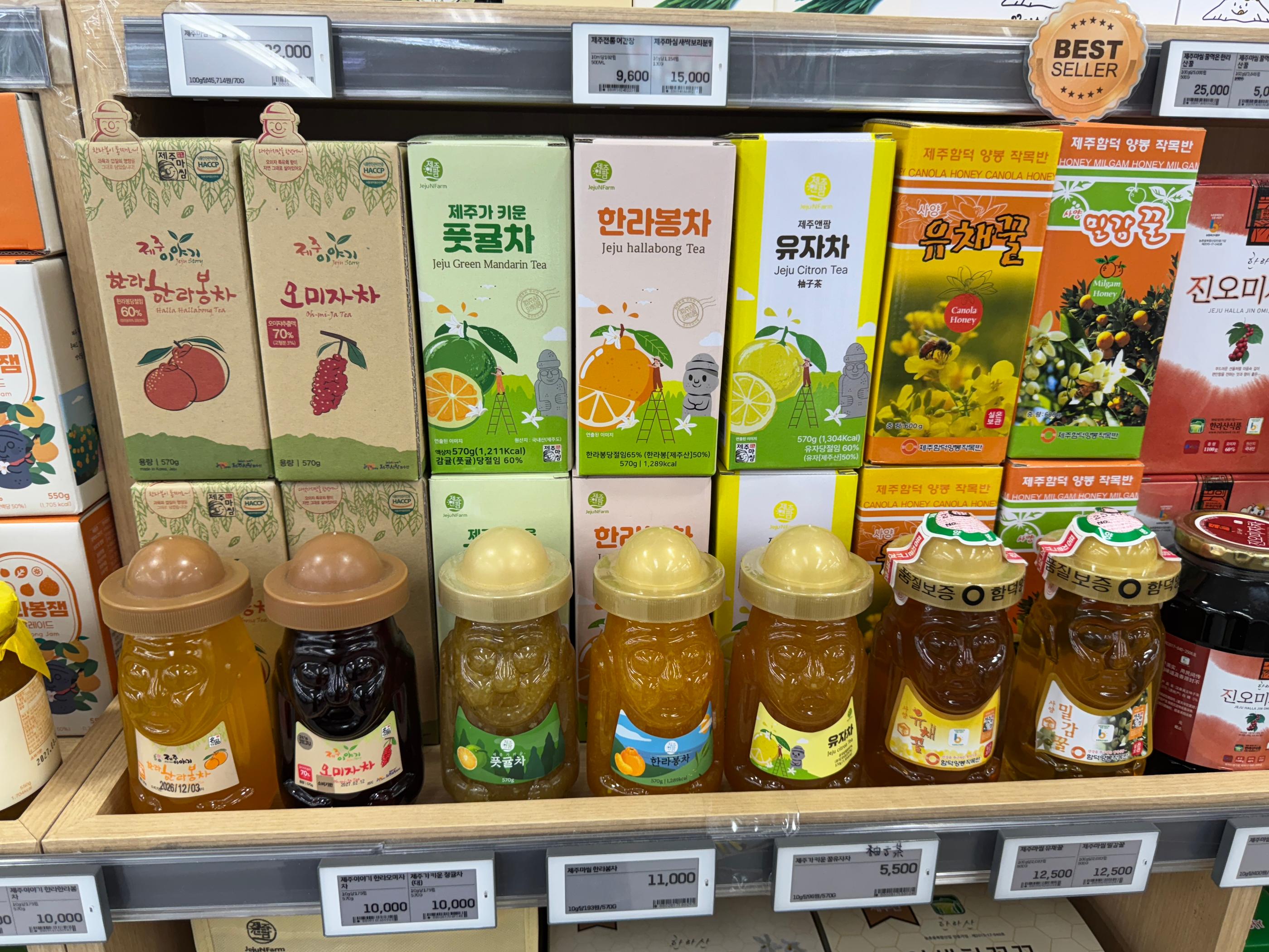 Khắp cửa hàng, hãy tìm các biển hiệu màu đỏ làm nổi bật những mặt hàng được du khách nước ngoài ưa chuộng. Những biển hiệu này chỉ ra những món quà lưu niệm tốt nhất, bao gồm trà Hallabong, thạch trái cây, bánh quy và rượu sản xuất tại Jeju—hương vị đích thực mà bạn chỉ có thể tìm thấy tại Đảo Jeju.