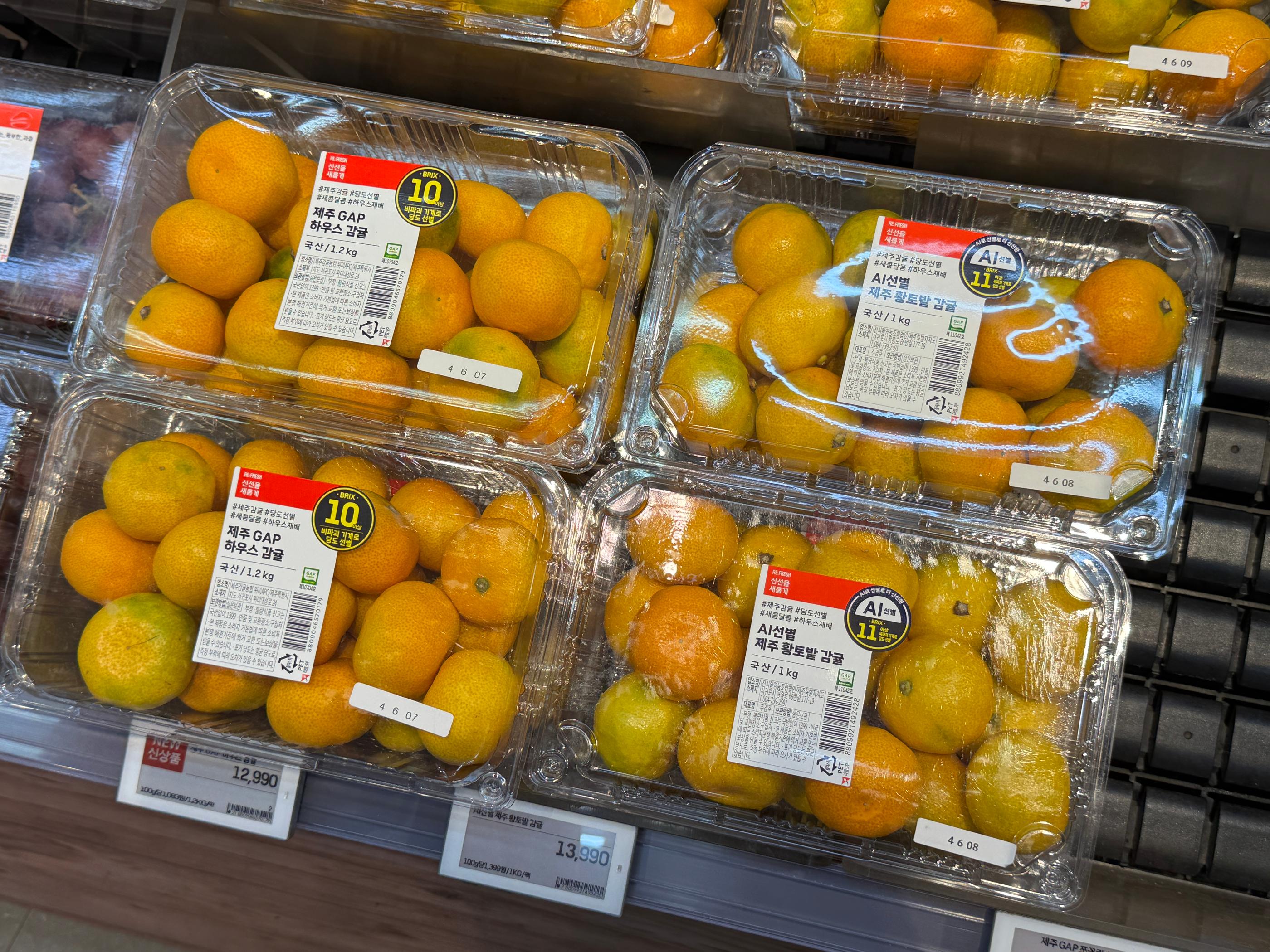 Vì bạn đang ở Jeju, đừng bỏ lỡ khu vực trái cây với những quả quýt Jeju ngọt ngào. Cửa hàng sử dụng AI để kiểm tra độ tươi, nên bạn luôn nhận được sản phẩm chất lượng cao nhất — khá thú vị, đúng không?