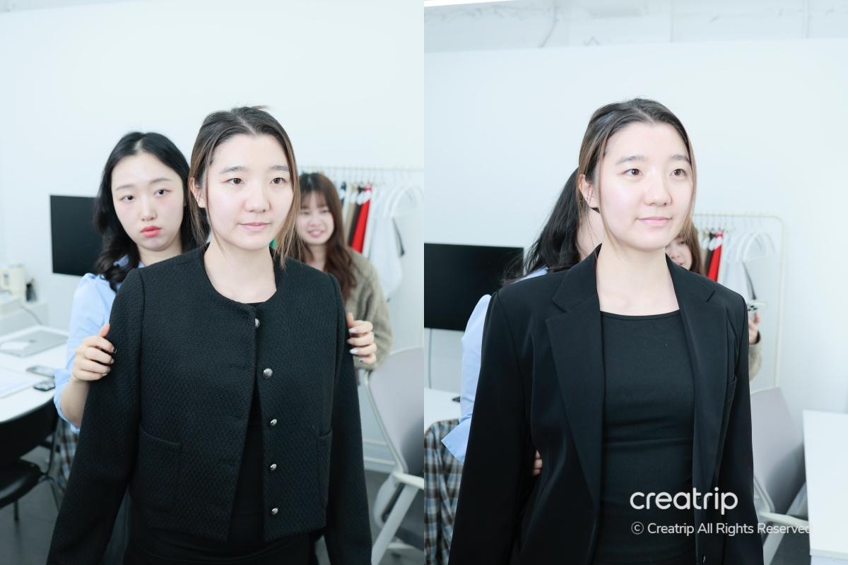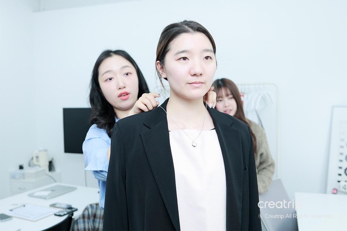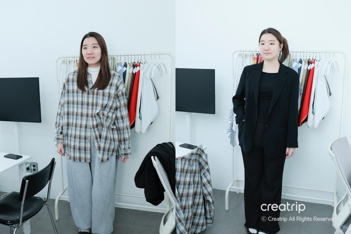 Sau khi kiểm tra hình dáng cơ thể, chúng tôi chuyển sang giai đoạn thử trang phục toàn bộ. Bạn tôi có thân hình kiểu Yeoksam với vai tương đối rộng, nên họ giải thích rằng việc phối đồ để làm mềm ấn tượng tuyến tính của phần thân trên là điều quan trọng.