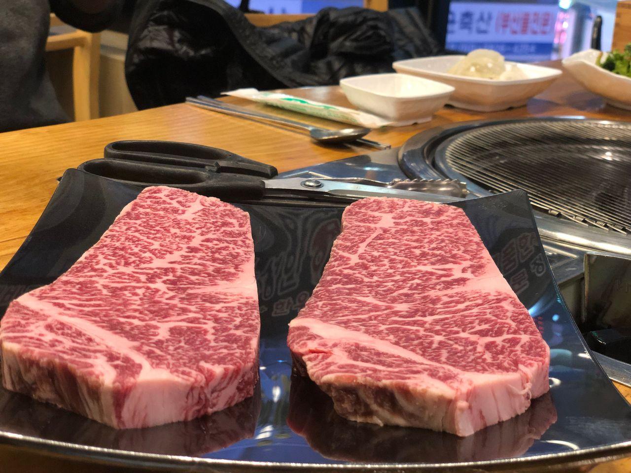 Chúng tôi đã chọn hai miếng bít tết bò Hàn Quốc loại 1++ được phân bố đều. Vì đây là lần đầu tiên chúng tôi thử Hanwoo, nên chúng tôi rất mong chờ!