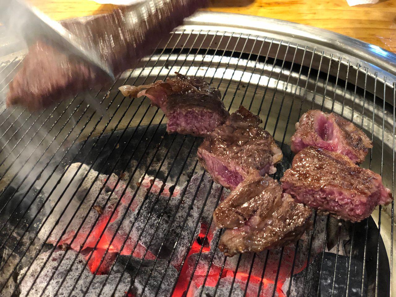 Thịt bò Hanwoo vân mỡ cao thực sự rất mọng nước, vì vậy khi nướng, bạn có thể thấy dầu và nước chảy ra từ bên trong miếng thịt. Mùi thơm thật tuyệt vời. Sau khi thịt chín đủ, chúng tôi cắt nó ra và bên trong là một lớp hồng xinh đẹp được tiết lộ.