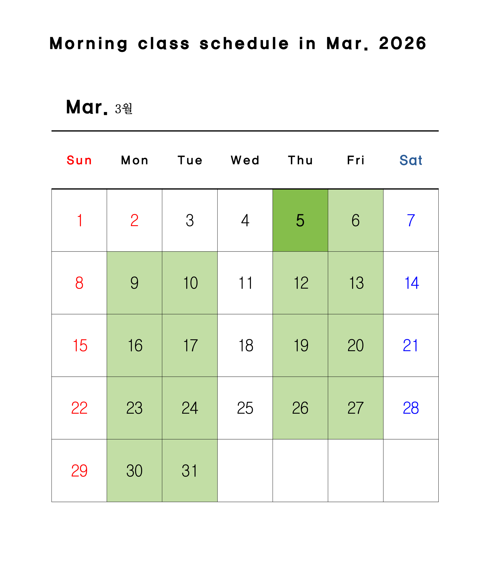 * Vui lòng tham khảo lịch của trường ngôn ngữ bên dưới. Các ngày có lớp học được tô màu xanh lá.