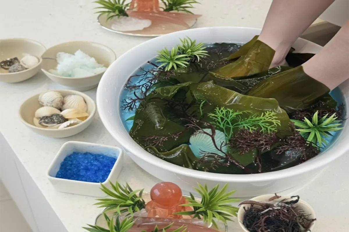 - Kiểm tra mùi thơm & tình trạng bàn chân → Thư giãn với hương biển → Muối biển, kem bọt ngâm chân & spa ngâm chân rong biển xanh → Tẩy tế bào chết bằng muối biển cho chân → Chăm sóc sừng mịn → Massage chân bằng dầu gua-sha đại dương → Mặt nạ dưỡng ẩm sâu cho chân → Chăm sóc hoàn thiện bằng dầu biển
