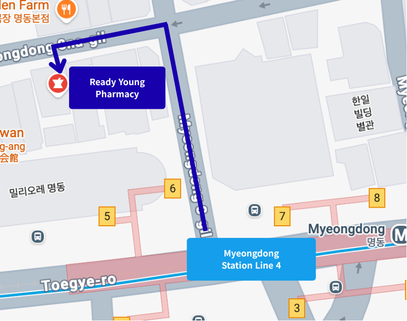 Nằm ngay lối ra 6 của Myeongdong Station. Dễ tìm với biển hiệu màu xanh đặc trưng. READY YOUNG PHARMACY, tọa lạc ở trung tâm Myeongdong, cung cấp không gian sạch sẽ và tiện lợi nơi bạn có thể mua thuốc, chăm sóc da K-Beauty và các vật dụng hàng ngày tất cả trong một.
