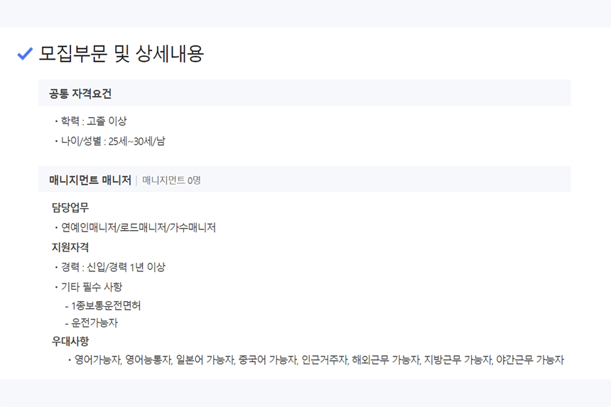 大家最好奇的是,该如何成为艺人的经纪人呢?因为这个工作需要保护艺人、负责艺人行程,所以之前都是以熟人推荐为主,但是在最近,韩国的求职网站上也有出现不少经纪公司的招聘广告。