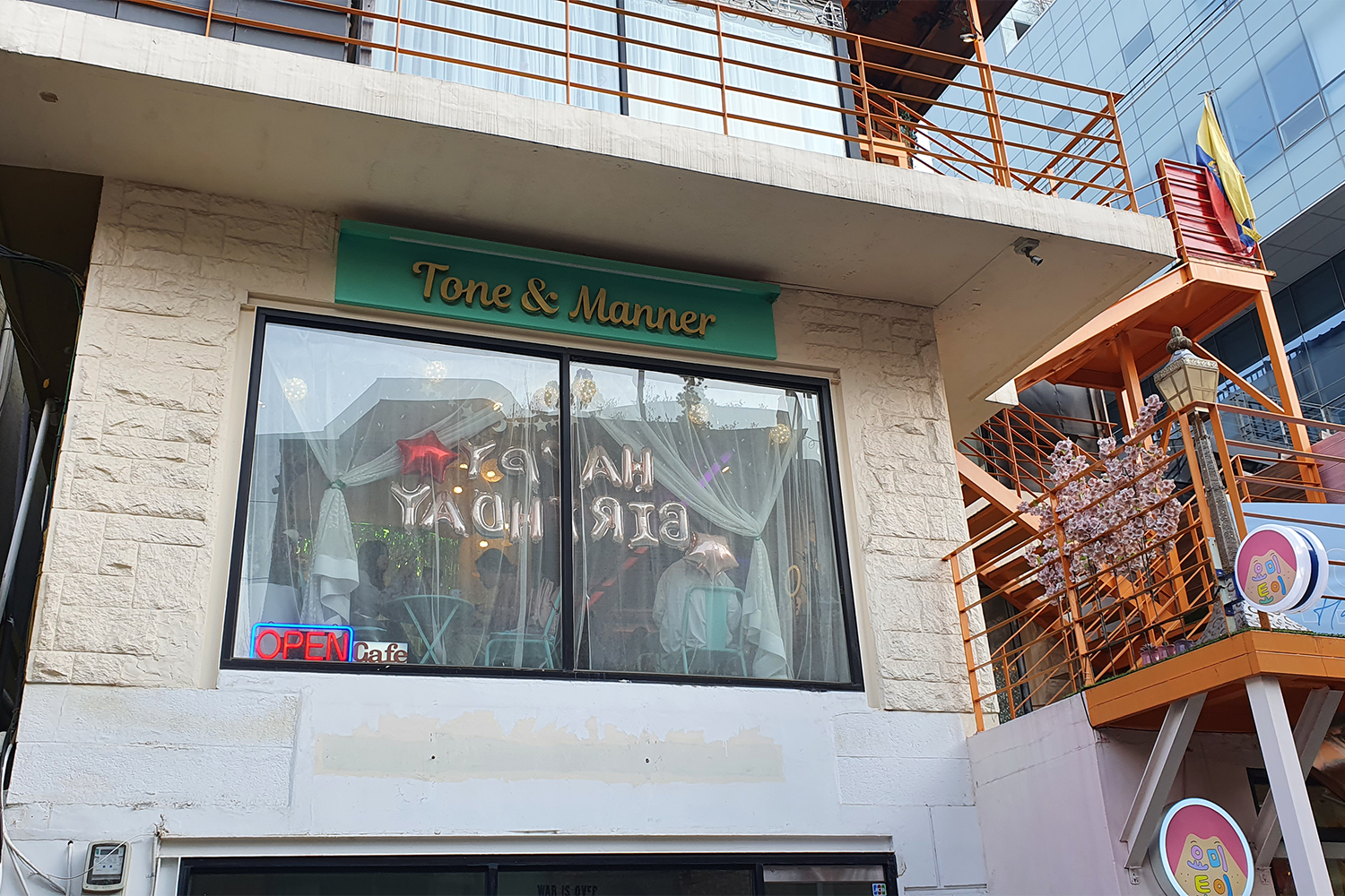 只是抵达咖啡厅外面,就能看到二楼的Tone & Manner大窗户已经贴有生日气球,旁边上楼的阶梯更是挂上Xiumin的生日横幅,只要经过这条路的人都会知道这里是Xiumin的生日咖啡厅,非常显眼。