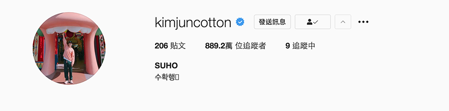 Suho的本名是金俊勉,而在韩文中,「勉」与「棉」都是「면」,因此他就把IG名称取成金俊「cotton」,是不是很可爱呢?