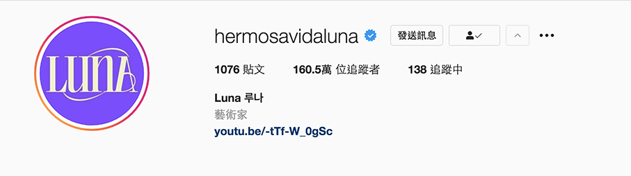 相信大家看到Luna的instagram ID,应该只看得懂后面的Luna吧?ID「hermosavidaluna」中的「Hermosa Vida」在西班牙文为「美丽的人生」,而Luna也是月亮的意思,这样来看,f(x)成员们似乎都喜欢用外语当做IG名称,非常有意思呢。
