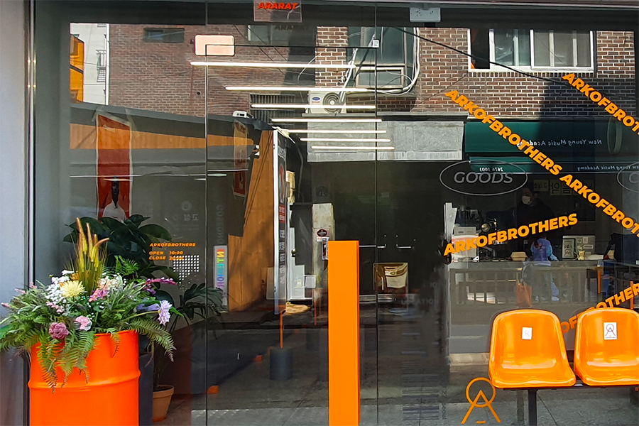 位于永登浦区的咖啡厅「ArkofBrothers」,从外观就能感受到满满的swag,在普遍阴郁、低对比的陈设中,突然出现了不少明亮橙色元素,让整间咖啡厅风格瞬间一跃而出。