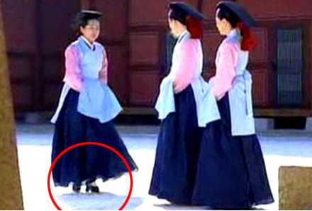 另外,《大长今》中为了让大部分宫女看起来身高一致,也会配给有跟的鞋子给演员穿。不过有时候快步走路时,就会不小心露出有跟的鞋子,让人好奇当初难道就有这类跟鞋了吗?