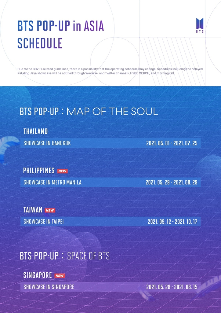 日前根据HYBE娱乐(原Big Hit)透露,除了已从本月01日,于泰国曼谷的开设的防弹少年团Pop Up:MAP OF THE SOUL Showcase店,05月29日将接棒于菲律宾马尼拉开设,而台湾也确定将在2021年09月12日于台北开设BTS快闪店,展期至今年的10月17日为止。