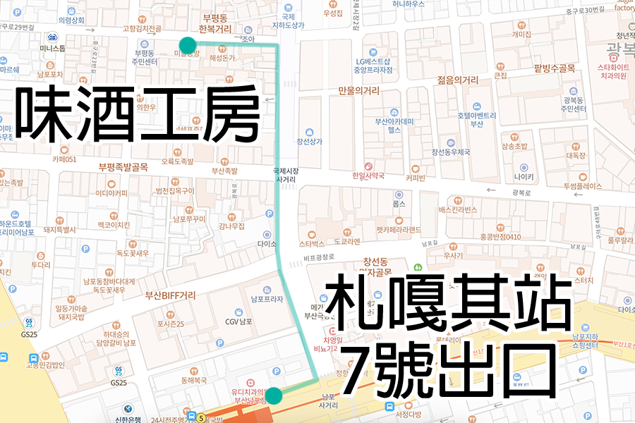 - 小撇步:由釜山地铁1号线札嘎其站(자갈치역)7号出口步行约7分钟,或由南浦站1号出口步行约15分钟。