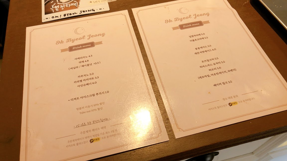 往十里咖啡厅「Ok, Byeol? Jeong!」店内的饮品不算太多,但基本的咖啡、气泡饮、茶类都有,店内低消是一人需要点一杯饮料。