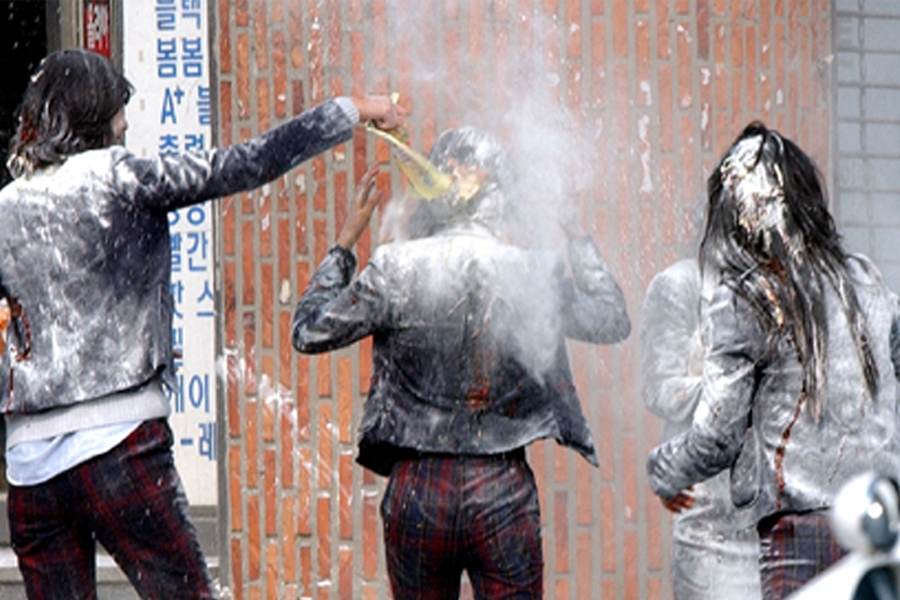 80至90年代的韩国毕业典礼,一定会准备面粉,当学校的毕典仪式结束后,学生就会互洒面粉,甚至加上蛋黄酱或鸡蛋等,让面粉更加附著在身上。韩国高中毕业典礼通常都是办在二月,正值超冷的冬天,就算不下雪,也会因为面粉的关系,看起来像下了雪的毕业典礼一样。