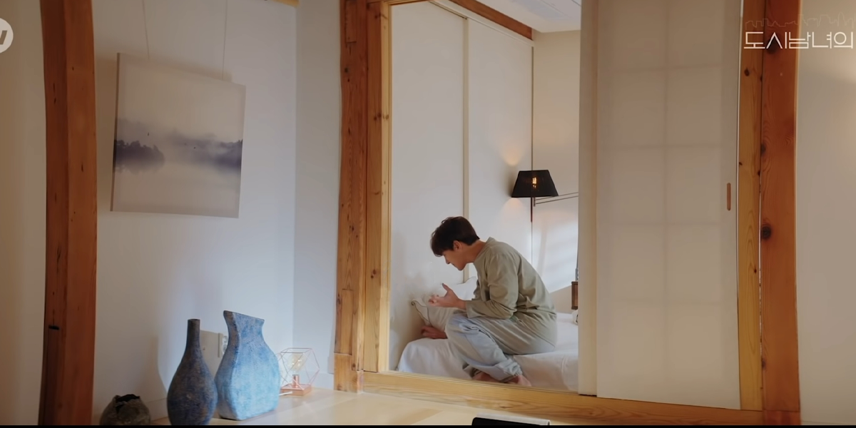 朴宰元在《爱在大都会》中担任建筑公司团队负责人,小编想,这也许就是他住在改造过的传统韩屋里的原因。房子保留韩屋特色的木制框架,并使用具有韩纸色调的白色壁纸,搭上现代感的家具,让传统和现代共存却无违和感。