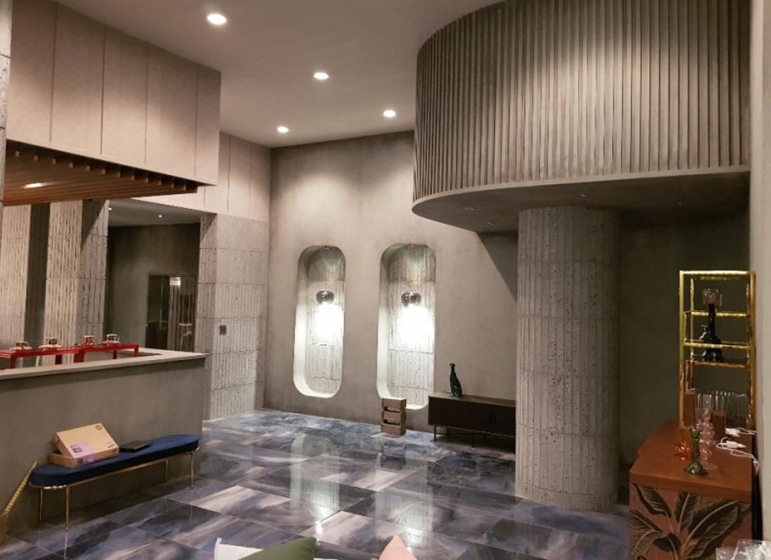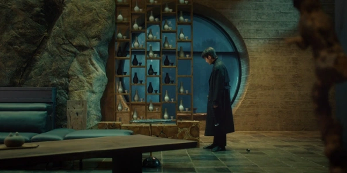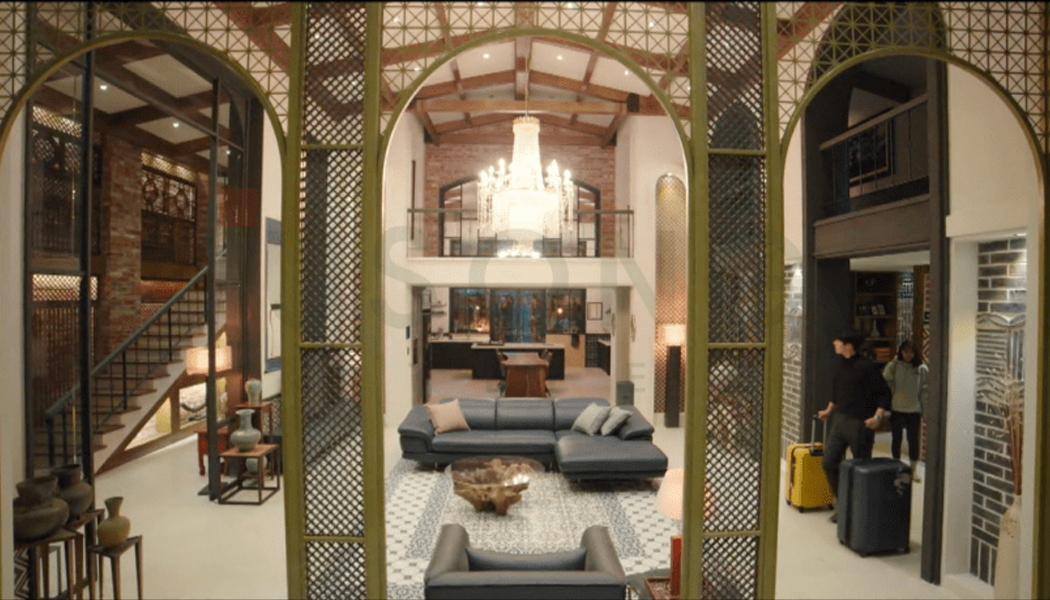 大理石地板、灰色调墙壁和柱子,以及挑高的室内结构,是张俊宇的豪宅中最显著的特征,整体给人一种精致冷酷的感觉,进一步凸显了张俊宇这个反派角色的魅力。