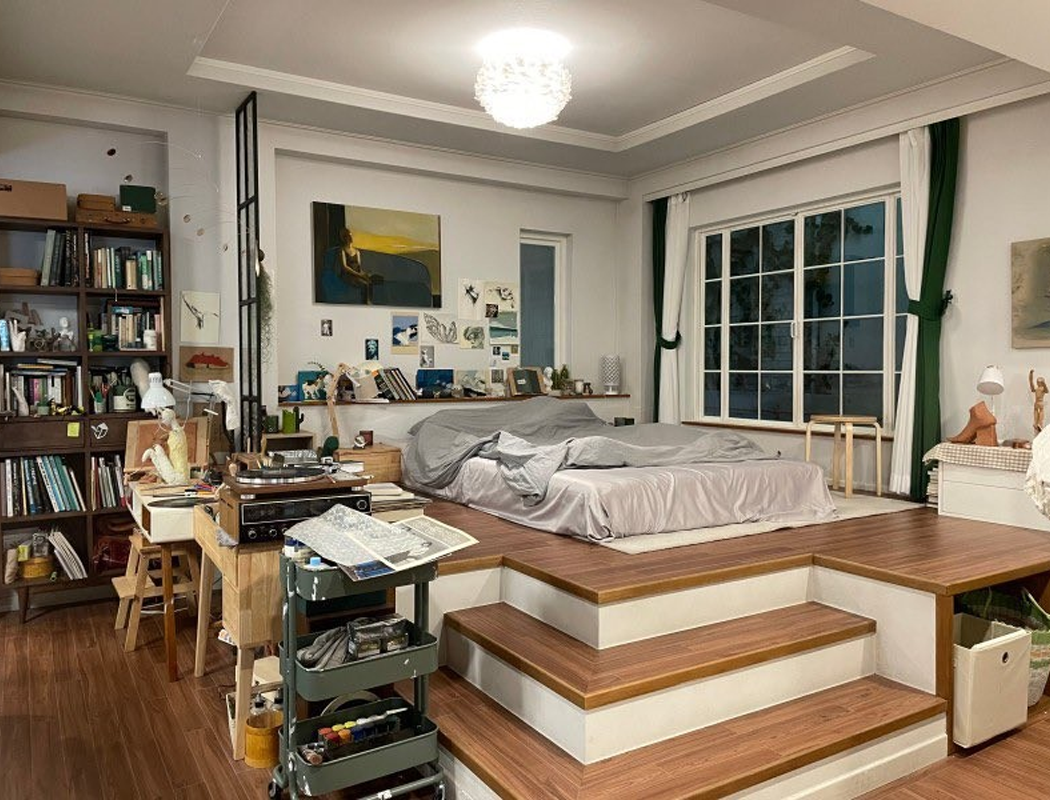 韩剧《无法抗拒的他》女主角刘娜比,住在一个宽敞的One Room型套房,利用阶梯地板,把床和日常生活空间区隔开来,让家里可以运用的空间变大,增加实用性的同时也增添了美感。