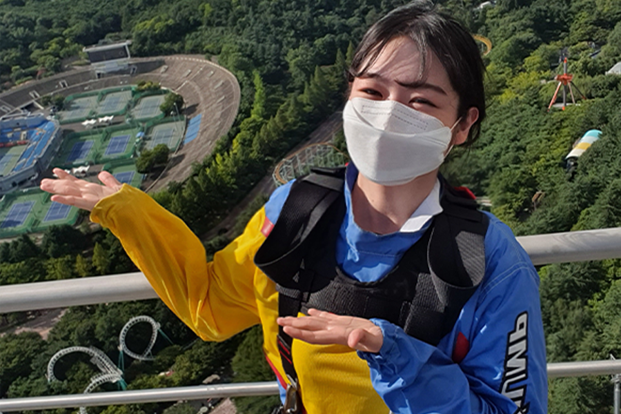 大邱83塔是世界第三高的高空弹跳,因此原本满怀信心的小编,在跳跃台前又突然害怕了……这个高度真的非常可怕,但多亏了亲切可靠的工作人员在旁边打气,加上想让大家看看大邱高空弹跳的心,小编才重新鼓起勇气。