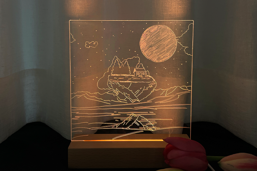 套件中共有五件物品,有压克力板、灯饰、木框、尺子和设计书。该灯采用USB端口,因此可以在任何地方使用。
