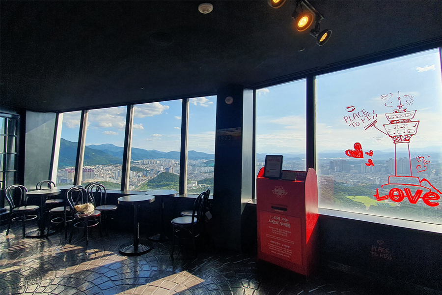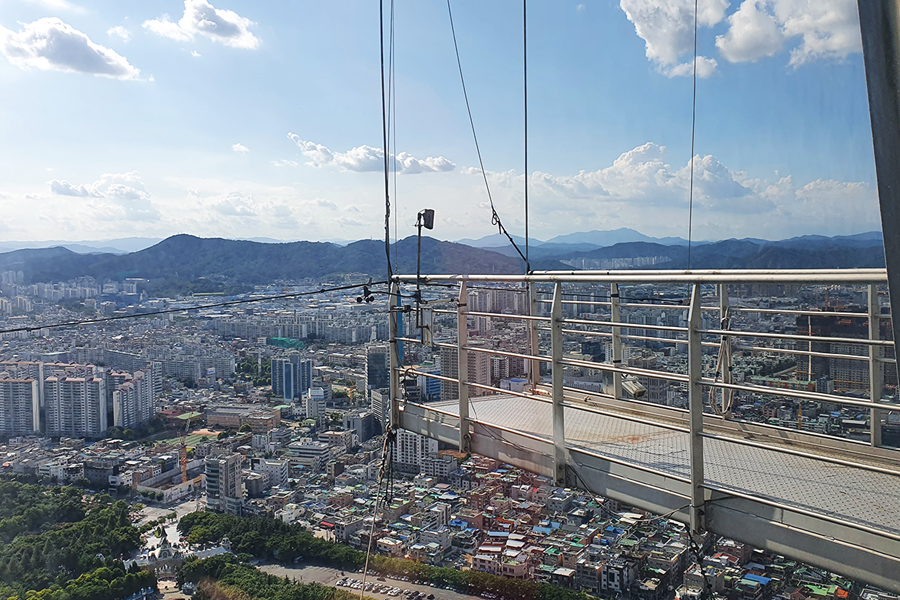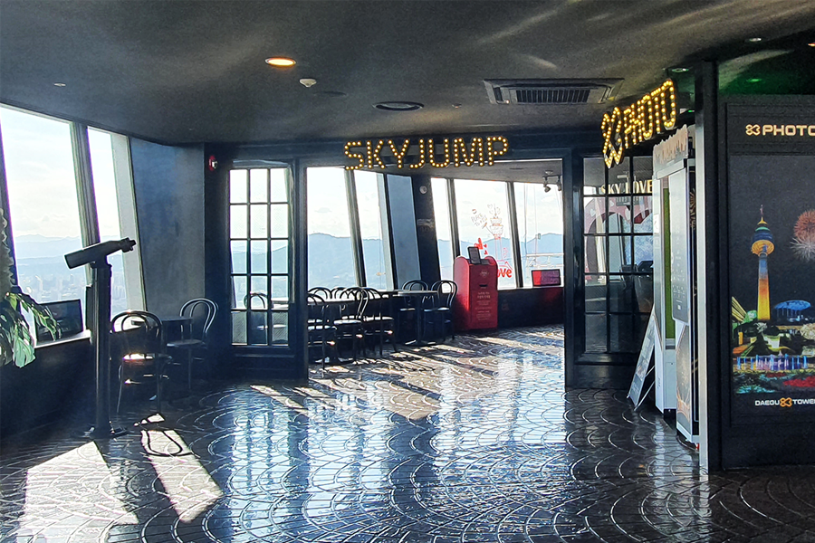 乘坐电梯到83塔的77楼后,就会看到观景台和高空弹跳的地方,向工作人员出示使用券就可以入场了;83塔的观景台离地123公尺,但包含海拔高度的话,高则为231公尺, 在这里可以将大邱的绝美风光整个一览无遗。