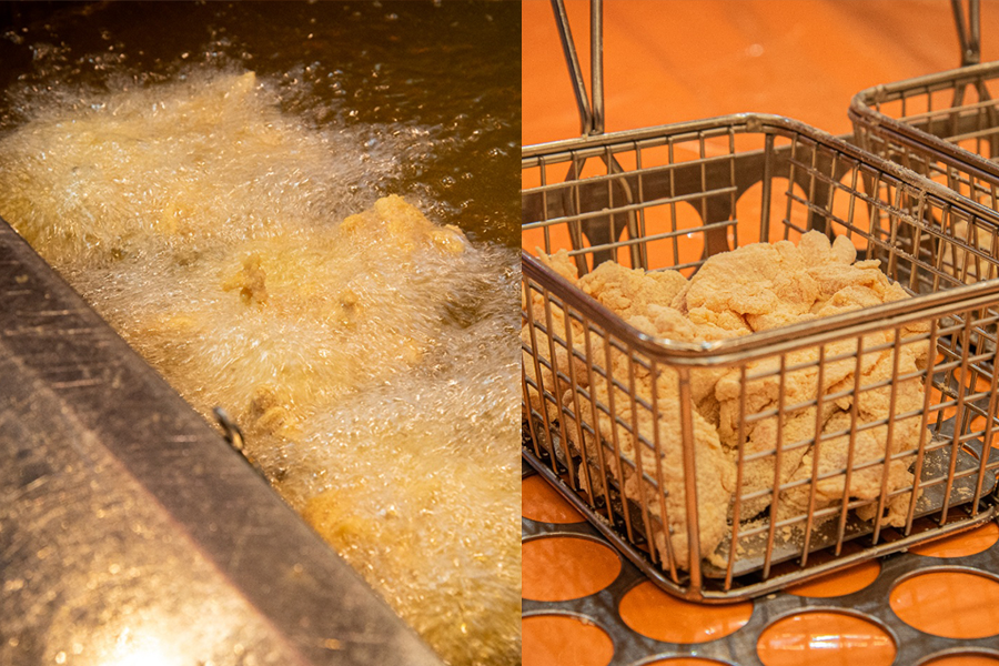 将面糊均匀地涂在鸡肉上后,就可以放进油锅油炸了。过程有点危险,因此会有专业师父来帮忙,大家可以透过窗口看到炸鸡油炸的过程。另外这里会提供一只550克的炸鸡,让大家可以尽情享用。