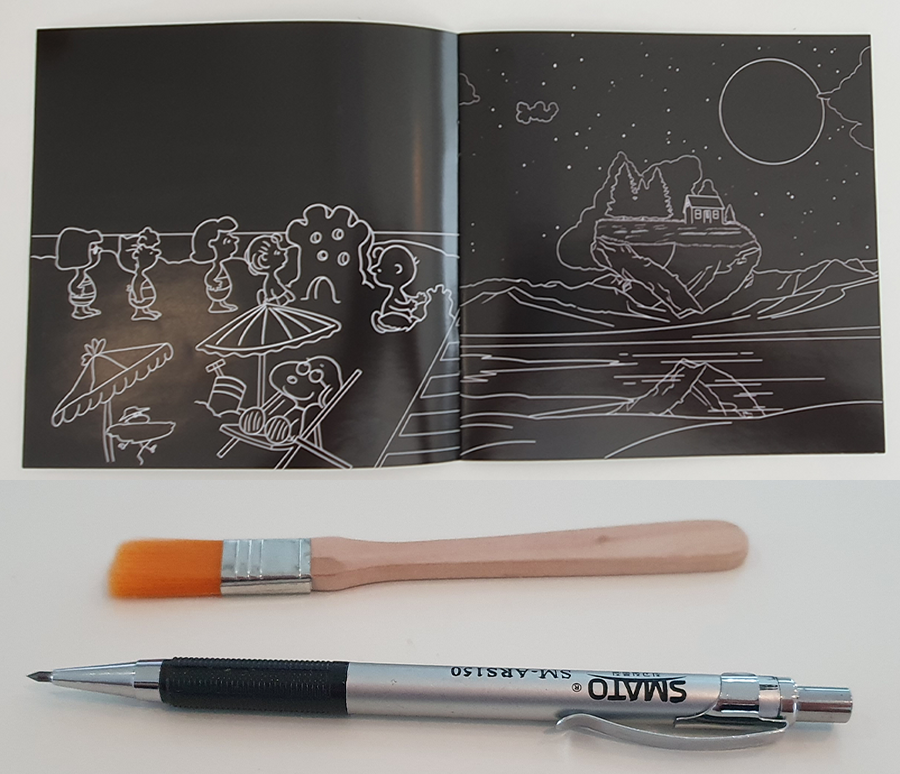 接下来,准备好铁笔和刷子就可以开始了。铁笔是用来刮压克力板的,再用毛刷刷掉压克力屑。