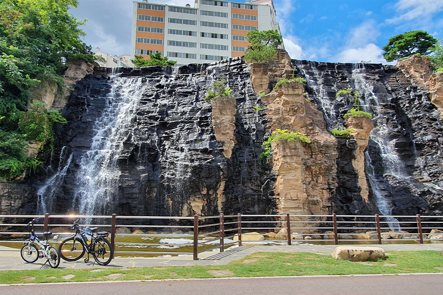在自行车道上,小编以大约20公里(小时)的速度骑行,真是刺激又好玩。因为是电动自行车,所以不需要花费太多力气。沿著路骑,还能找到大邱Ayang瀑布(아양 폭포),在这里拍下漂亮的照片,感觉非常不错呢。