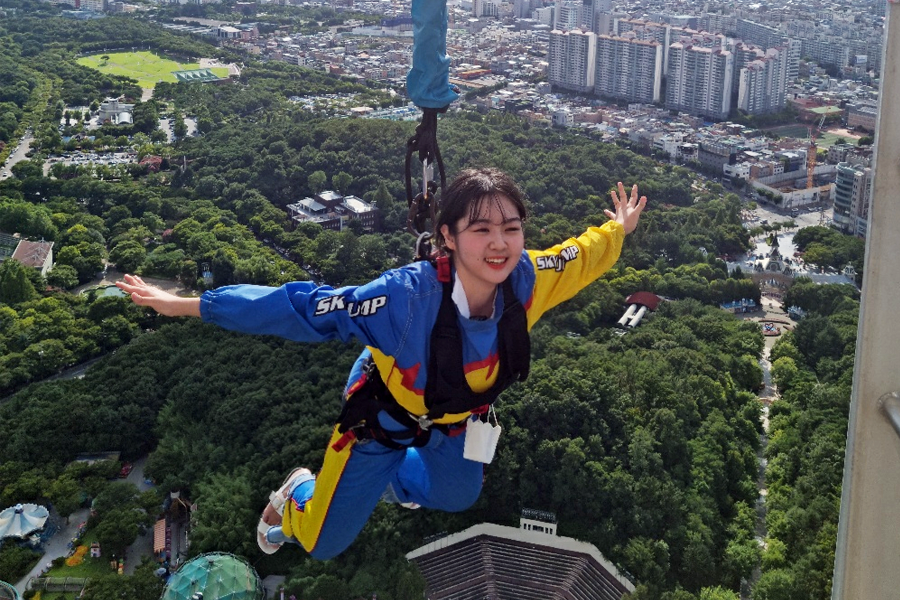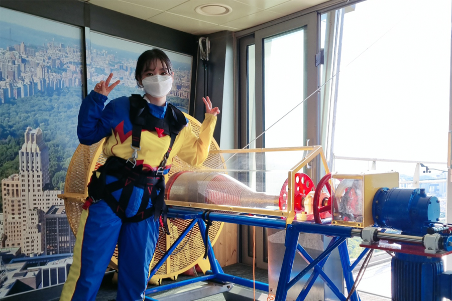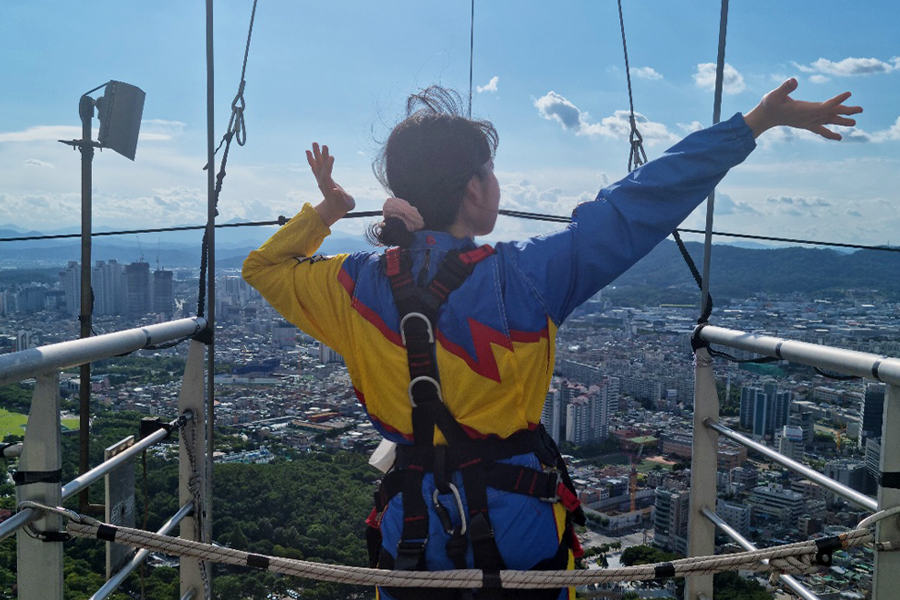 大邱83塔的高空弹跳有两种体验方法,两种小编都试过了;第一种是上图那样,悬挂在绳子上,从高空将落下来,就像飞行那样,摆出漂亮的姿势拍照留念。