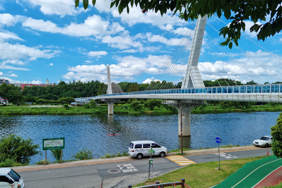 这里是大邱琴锦湖河日出大桥,过桥之后就是东村游乐园,沿路上都有完善的自行车道,但也记得过桥时,是要用牵脚踏车的方式过去喔。