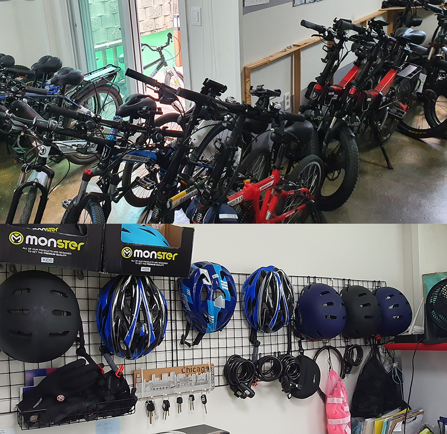 在店内有一般自行车、电动自行车和相关安全设备,老板会依据骑手的体格推荐自行车。而这种电动自行车,虽然看起来就像一般脚踏车,但层次完全不同呢。
