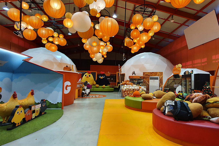 进到园区后,会发现这个宽敞的主题公园,就像游乐园与展示厅,里面的摆设述说著当当和咕咕,正努力寻找最好的炸鸡食谱的故事。