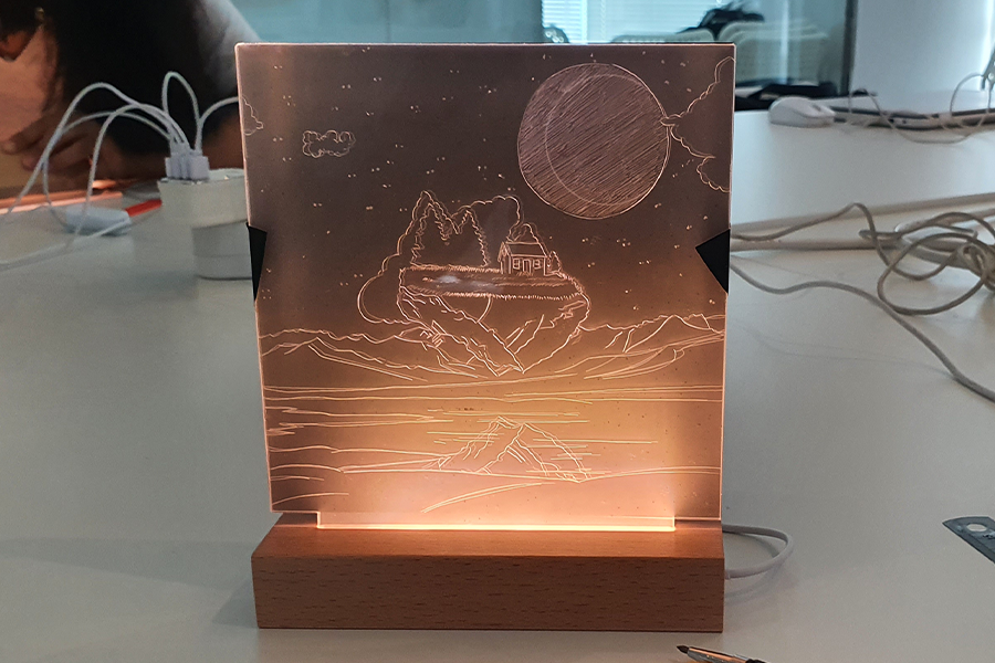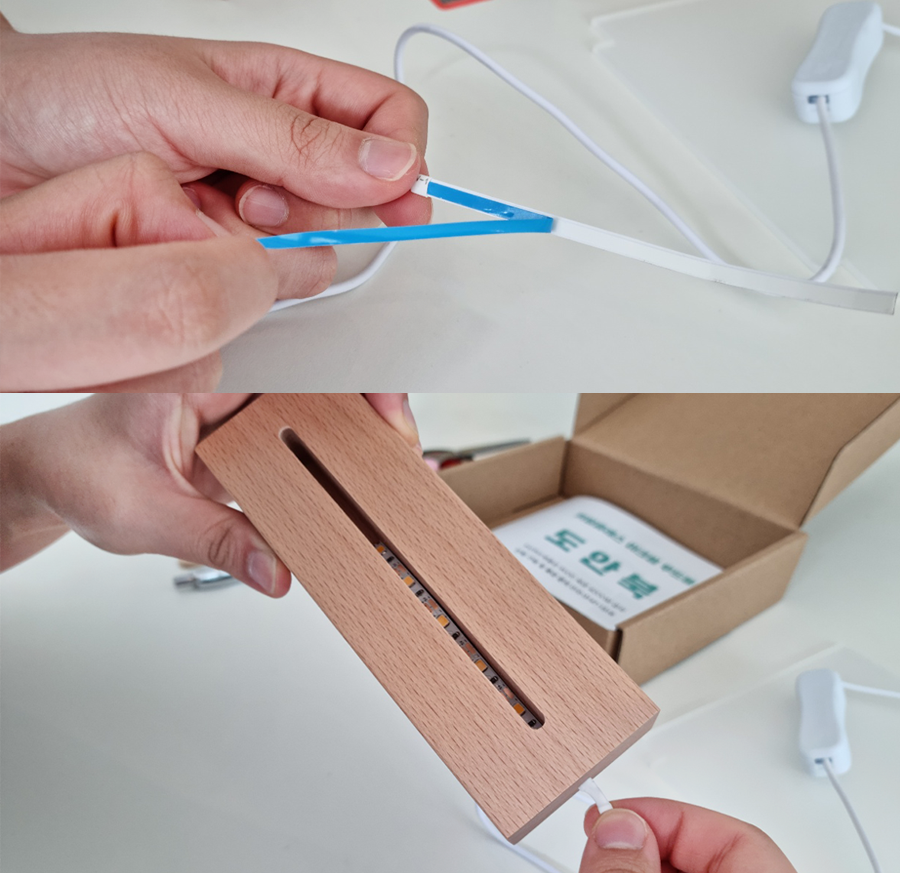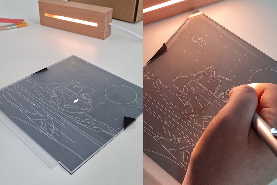 如果想在制作中检查有没有做好,可以插进木框来检查一下。用铁笔刮去压克力板的制作,真的相当新颖,小编也很开心,并且对最后的成品十分满意。因为是亲手制作的,所以特别有意义,之后有机会,也来大邱Kipping Class,轻松体验有趣的木质灯吧。