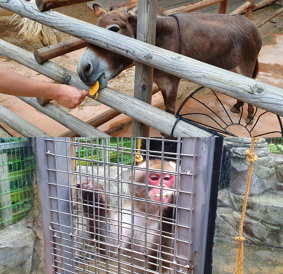 如果在动物区有看到喂食的标示,就代表这里的动物是可以互动、喂食的,大家可以给动物吃篮子里的食物,但一定要注意安全,也不能喂食一般人类吃的食品喔。