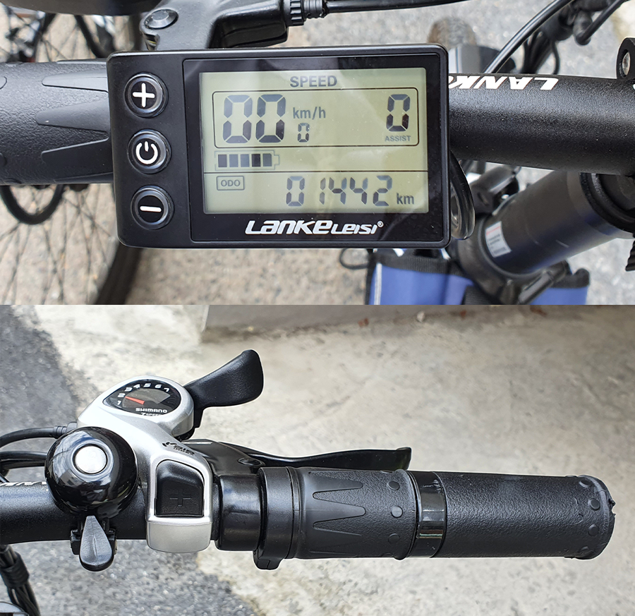 左手把上安装了这样的机器,按下电源后,按「+」是加速、按「-」是减速,也能随时查看骑乘速度,可以一边检查一边调整自己的速度;若骑乘时出现问题,可以用右侧的手把,将电动设置为0后,再转动右手把,就能获得加速,转得越多就越快,可以稍微习惯一下。