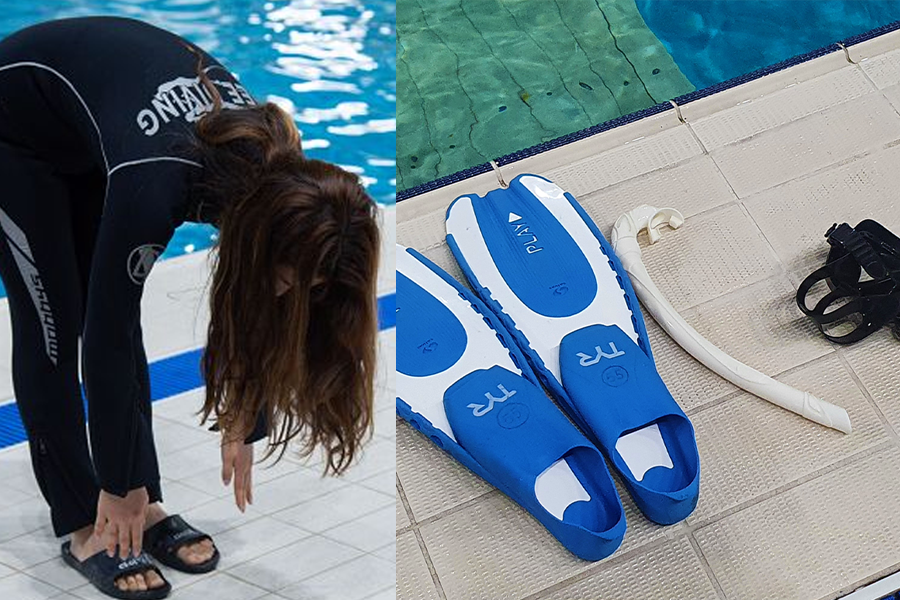 跟著教练的脚步进入泳池后,按照指示,在更衣室和淋浴间换上泳衣(现场有置物柜)。在换上泳衣后,教练会为了自由潜水的学生准备装备,穿上蛙鞋后可以像美人鱼一样游泳,呼吸管面罩也可以帮助大家在水中呼吸并睁开眼睛。