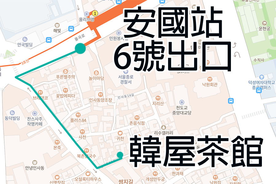 - 小撇步:首尔地铁3号线安国站(안국역)6号出口出来直走,在大马路口(转角有GS25)左弯进去,在O'sulloc茶屋对面(人人商场前)的巷子弯进去,就会看到韩屋茶馆。