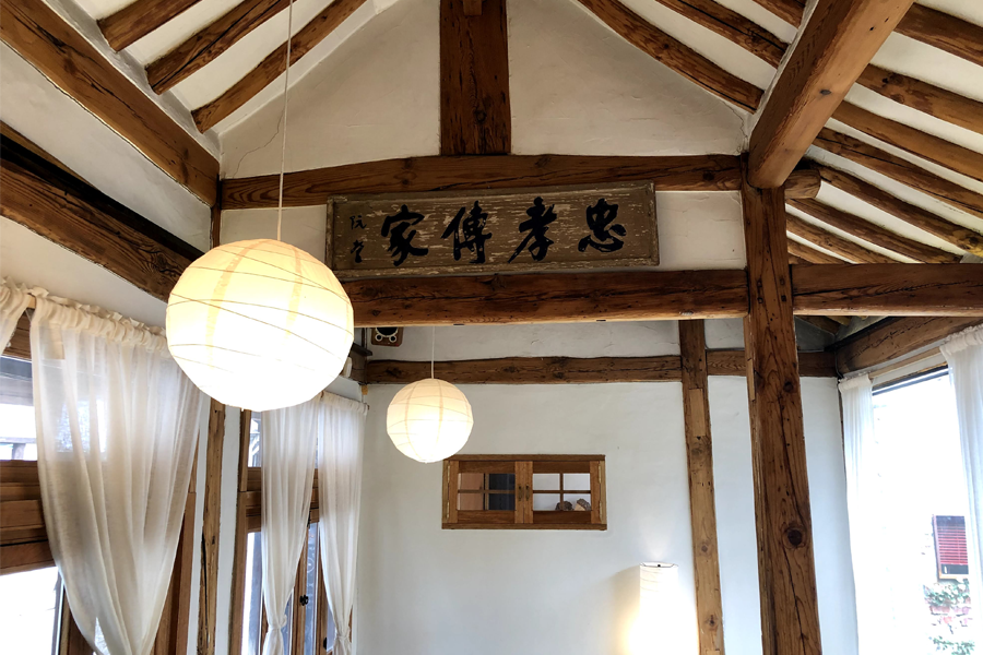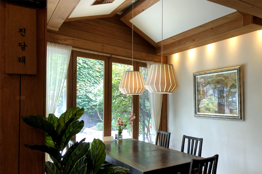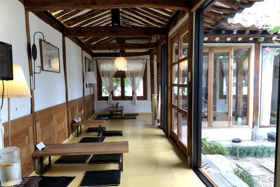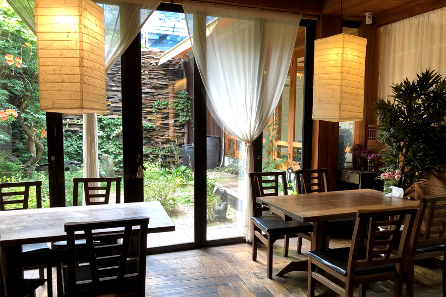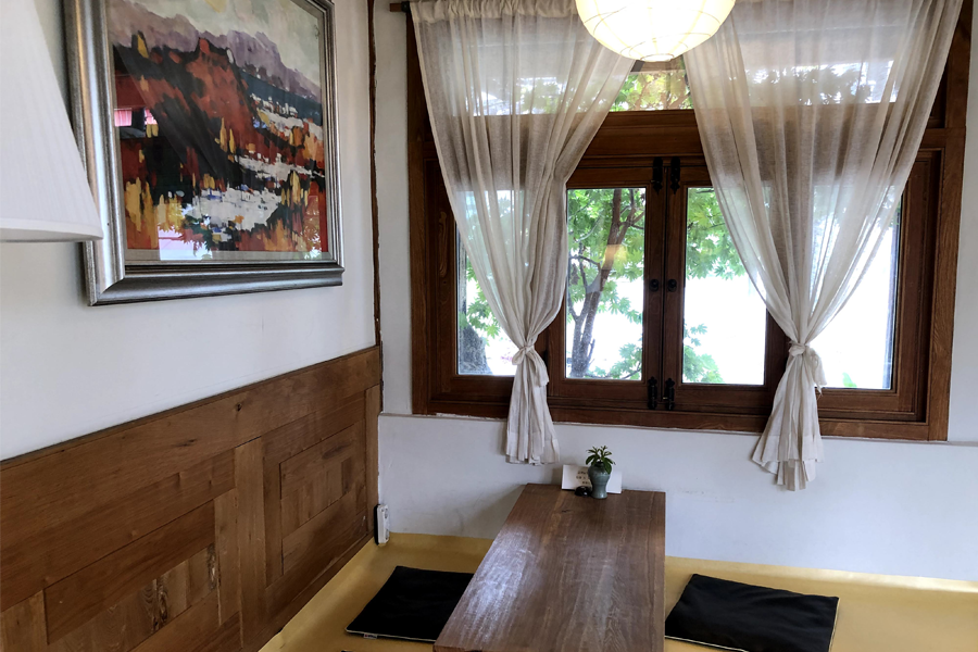 阳光洒进一旁的落地窗非常的美,有时「韩屋茶馆」会开窗通风,可以顺便享受一下自然庭院的感觉。