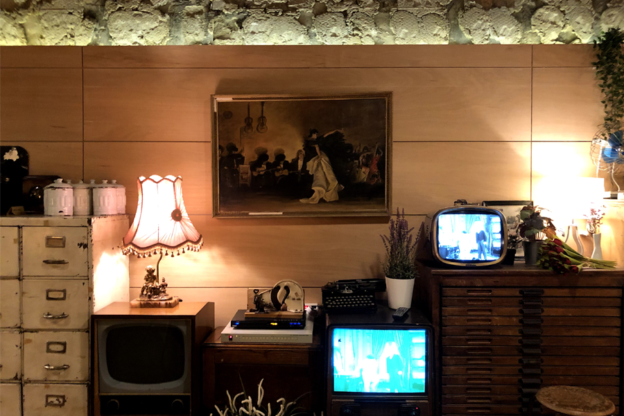 作为装饰的电视中播放著卓别林的影片,和一旁旧式的装潢仿佛像是穿越时空到了1930年代。
