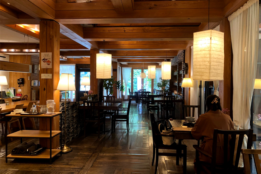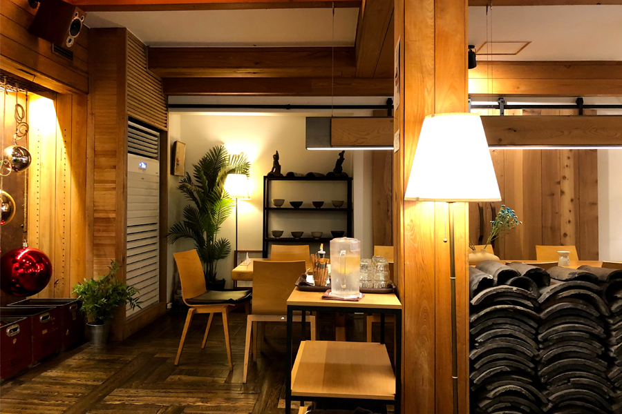从建筑的外墙到走廊旁的摆设,都看得出来店家十分用心在装潢的细节上;店内的室内区分成两区,一区是依照韩国传统韩式茶屋的方式,需要脱鞋席地而坐,一区则是用木桌椅配制而成的座位区。