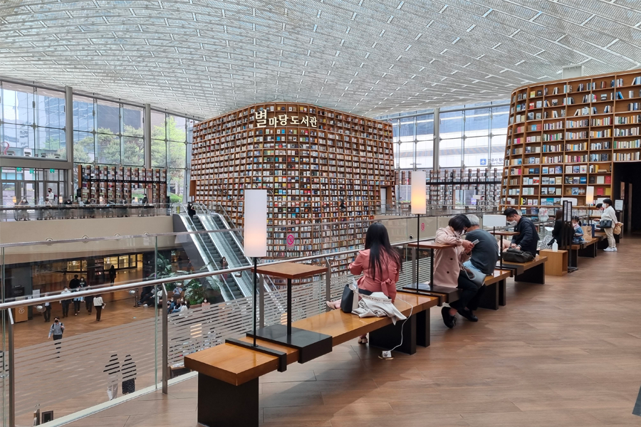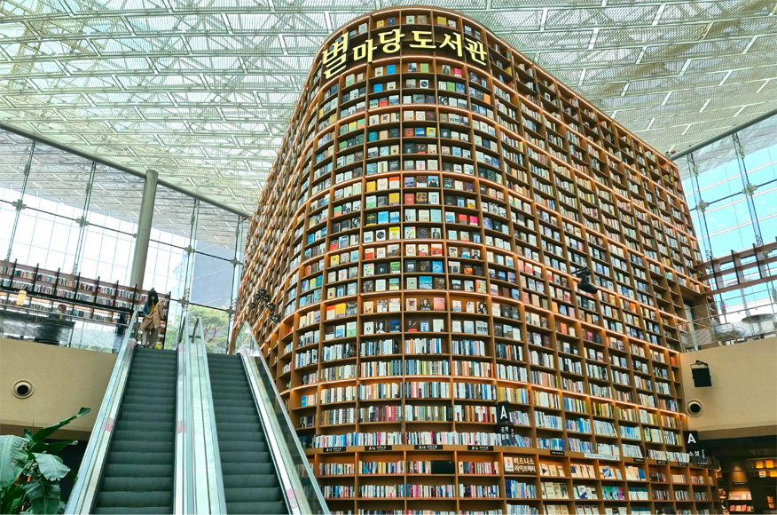 蜿蜒上天的书墙,令人叹为观止,而且现场也有非常多桌椅,在COEX逛累的人也能在这休息,感受空旷、明亮的空间,以及专属于「星空图书馆」的魅力。