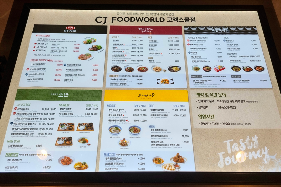从COEX水族馆和电影院的入口开始到中间,有非常多特色餐厅,但小编更想品尝一下COEX的美食广场「CJ Food World」,这里有牛排、中式料理、韩式料理、泰式料理都有,选择相当多样。
