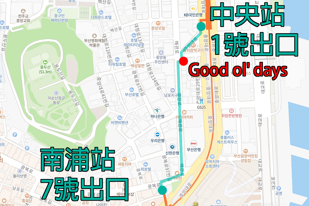 - 小撇步:釜山地铁1号线中央站(중앙역)1号出口步行1分钟,或南浦站(남포역)7号出口步行3分钟(详细路线图请参考文末)。